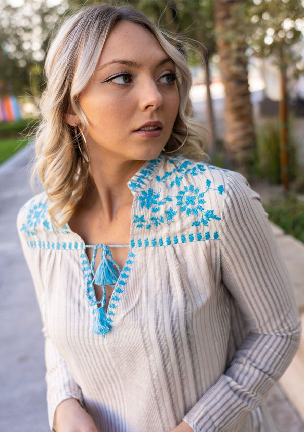 [Color: Navy/Gold] A front facing image of a brunette model wearing a navy and gold striped billowy maxi dress with a breezy, relaxed fit, sheer design, scoop neckline, and strappy back. An effortless cotton dress for vacation or beach. [Color: Navy/Gold] A back facing image of a brunette model wearing a navy and gold striped billowy maxi dress with a breezy, relaxed fit, sheer design, scoop neckline, and strappy back. An effortless cotton dress for vacation or beach.