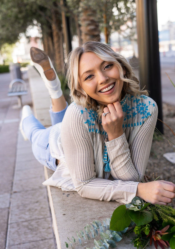 [Color: Natural/Blue/Red] A brunette model wearing a lightweight geometric pattern scarf with a striped border and fringed trim, adding a stylish touch to her look. Perfect for any season.[Color: Natural/Blue/Red] A brunette model wearing a lightweight geometric pattern scarf with a striped border and fringed trim, adding a stylish touch to her look. Perfect for any season.