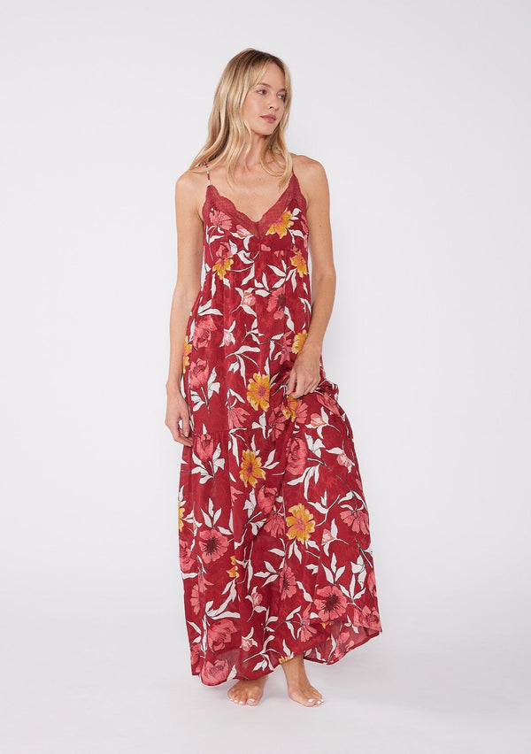[Color: Wine/Gold] Lovestitch red sexy, vintage inspired, large floral print, lace back, tiered slip maxi dress.[Color: Wine/Gold] Lovestitch red sexy, vintage inspired, large floral print, lace back, tiered slip maxi dress.