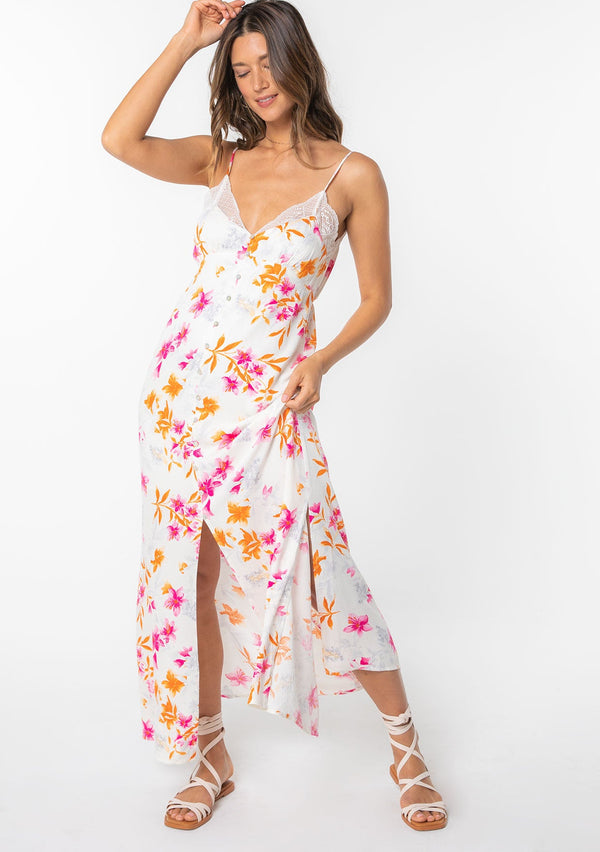 [Color: Ivory/Fuchsia] A model wearing a white maxi slip dress with pink floral print and lace trim. [Color: Ivory/Fuchsia] A model wearing a white maxi slip dress with pink floral print and lace trim.
