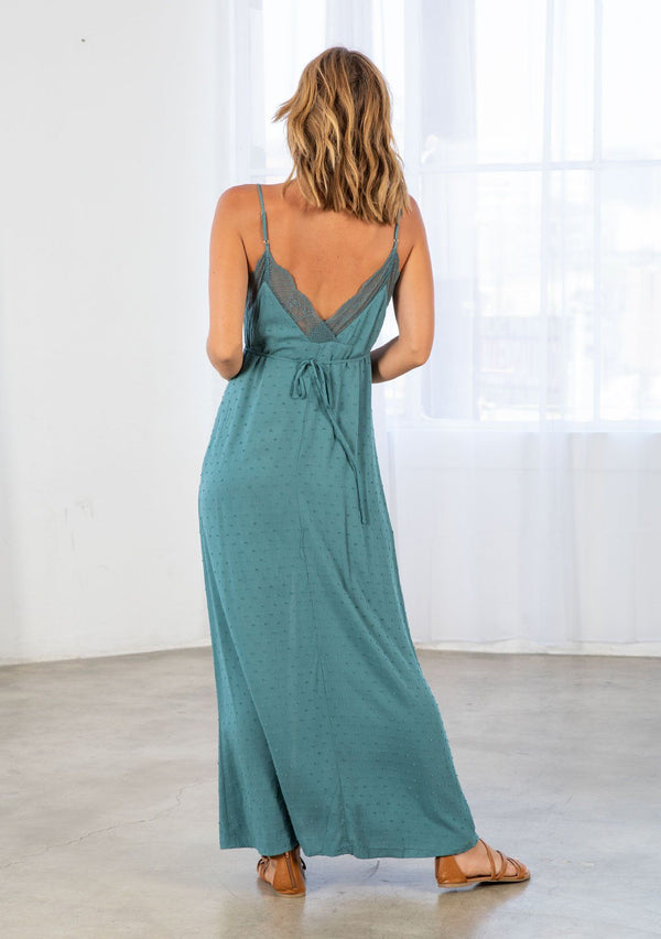 [Color: Silver] A model wearing a silver maxi slip dress in textured clip dot. With a lace trim v neckline in front and back, a self covered button front, a front slit, and a waist defining tie in the back. [Color: Silver] A model wearing a silver maxi slip dress in textured clip dot. With a lace trim v neckline in front and back, a self covered button front, a front slit, and a waist defining tie in the back.