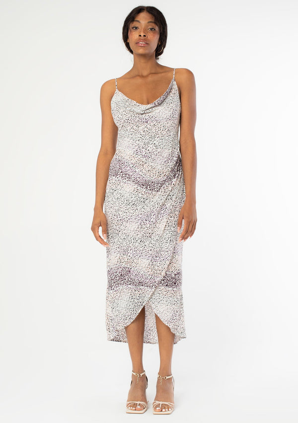 [Color: Ivory Mocha] A side facing image of a blonde model wearing brown  snake print midi dress  with a cowl neckline. [Color: Ivory Mocha] A front facing image of a blonde model wearing brown  snake print midi dress  with a cowl neckline.