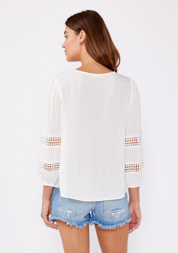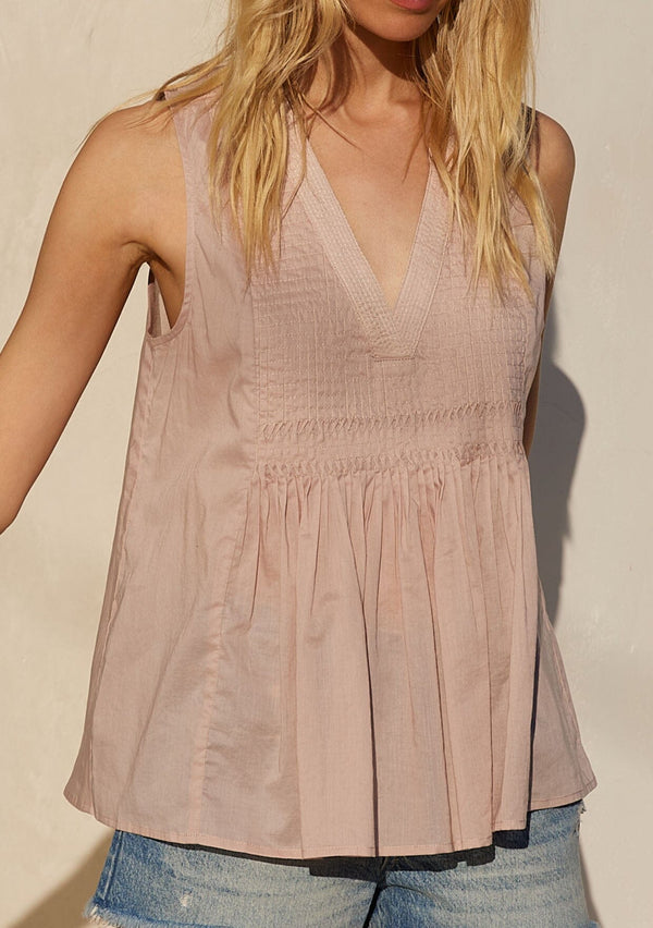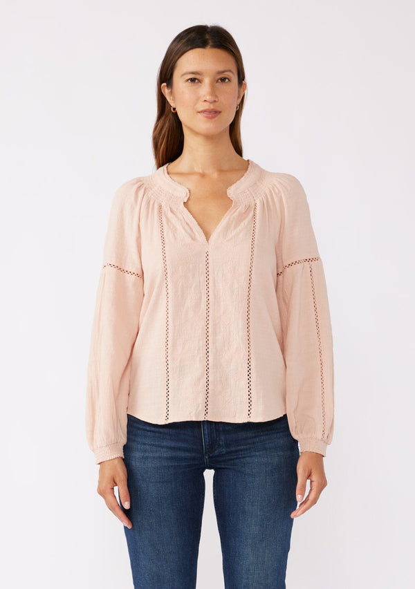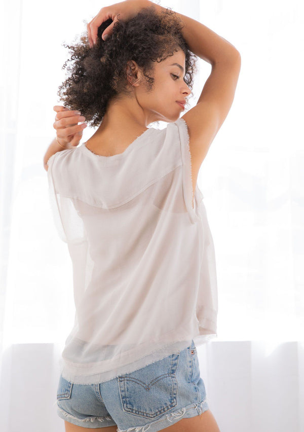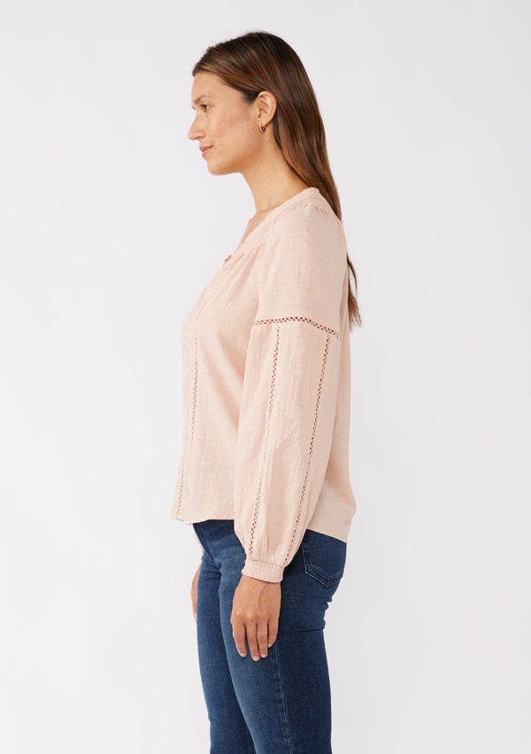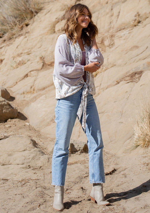 [Color: Stone] A model wearing a slightly cropped classic stone grey peasant top. Featuring a split v neckline with tassel ties, long voluminous balloon sleeves, and gathered details along the yoke. [Color: Stone] A model wearing a slightly cropped classic stone grey peasant top. Featuring a split v neckline with tassel ties, long voluminous balloon sleeves, and gathered details along the yoke.