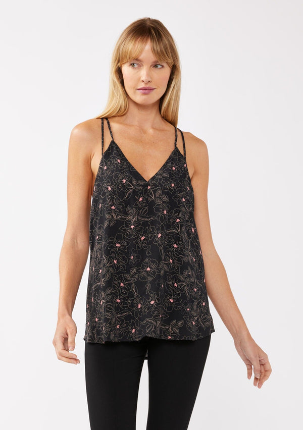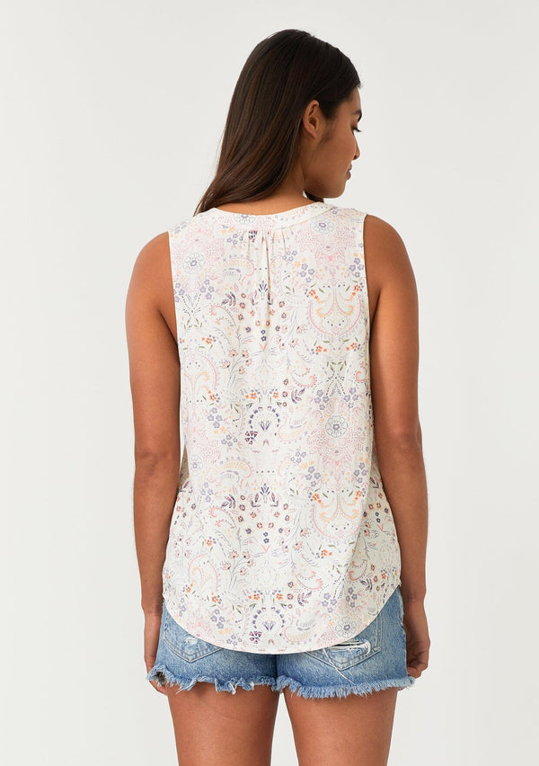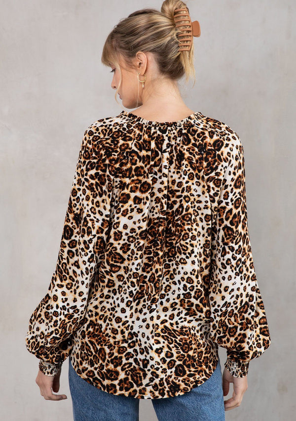 [Color: Black/Taupe] A model wearing a bohemian black and taupe bandana paisley print button front top. With a pretty self covered button front, tie wrist cuffs, and a flattering v neckline. [Color: Black/Taupe] A model wearing a bohemian black and taupe bandana paisley print button front top. With a pretty self covered button front, tie wrist cuffs, and a flattering v neckline.