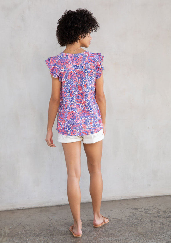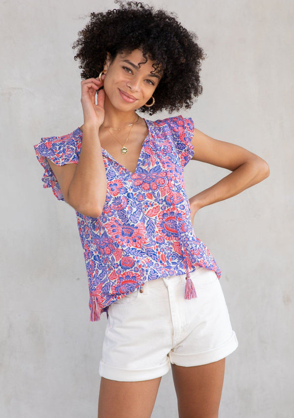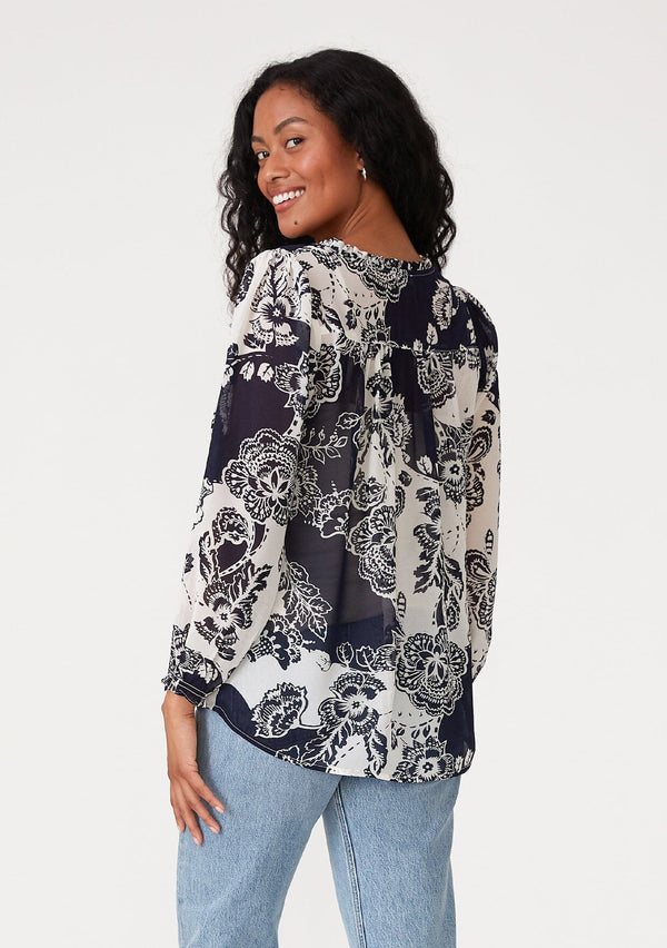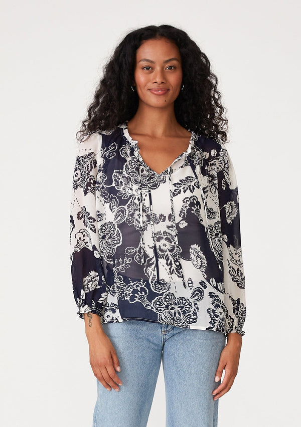 [Color: Cream/Navy] A model wearing a sheer chiffon slightly cropped top in an abstract floral multi color Ombre top. With short kimono sleeves, a smocked elastic waist, an open tie back, and gathered details along the shoulder. [Color: Cream/Navy] A model wearing a sheer chiffon slightly cropped top in an abstract floral multi color Ombre top. With short kimono sleeves, a smocked elastic waist, an open tie back, and gathered details along the shoulder.
