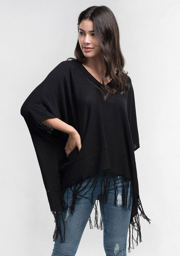 [Color: Black] A model wearing a flowy black oversized collared tunic top.[Color: Black] A model wearing a flowy black oversized collared tunic top.