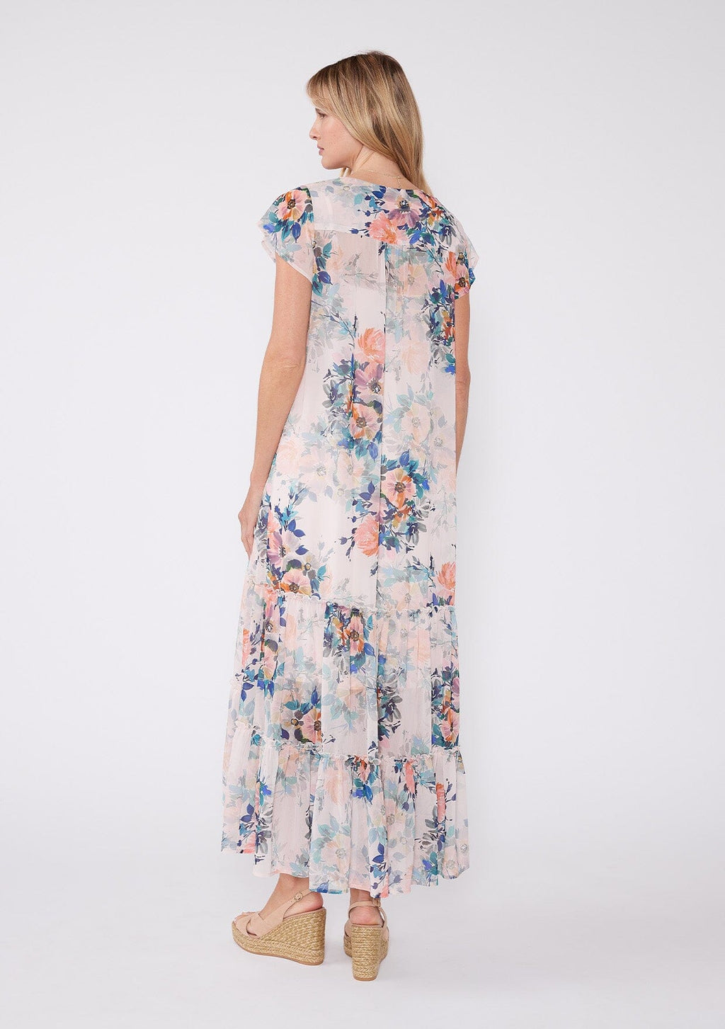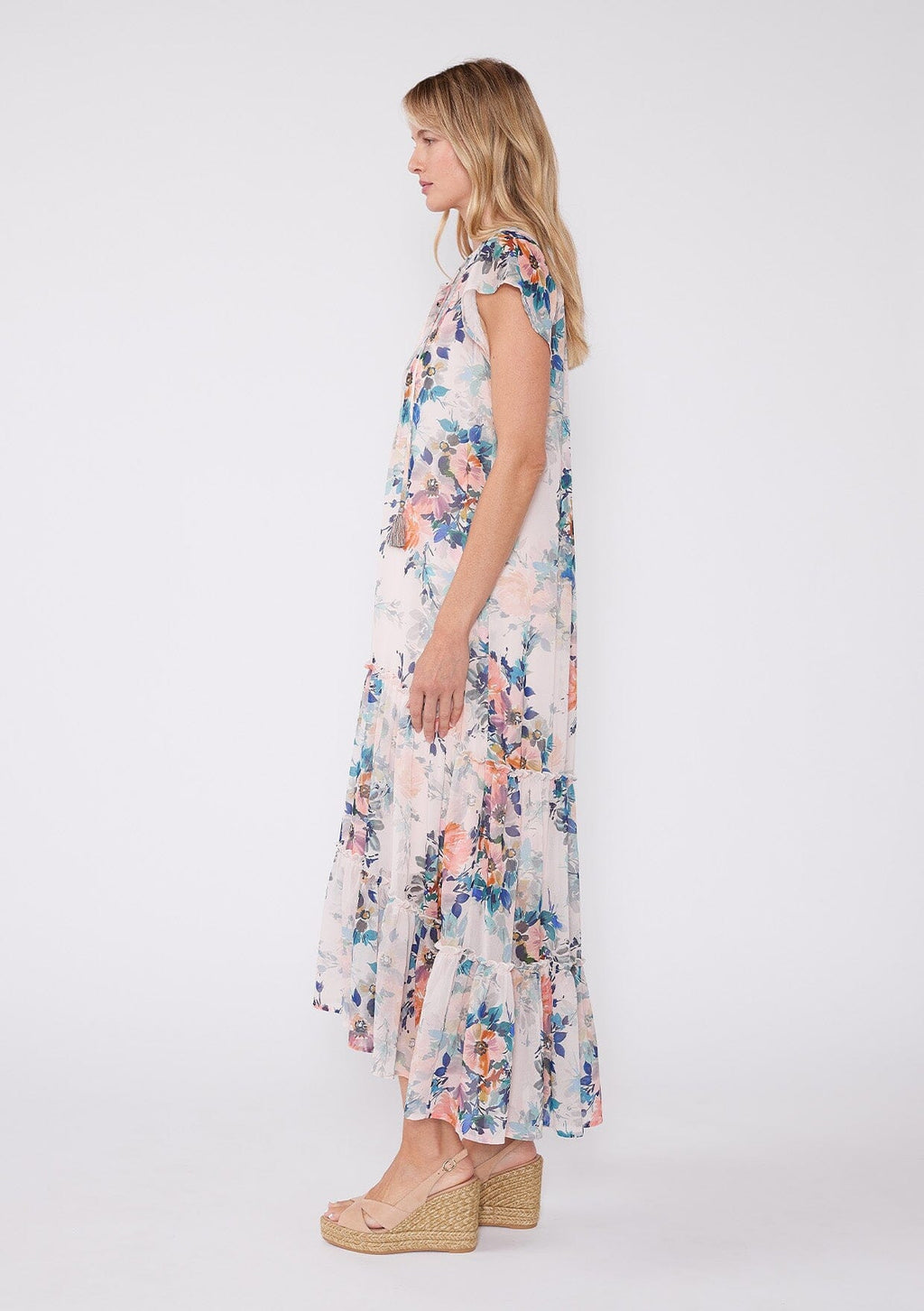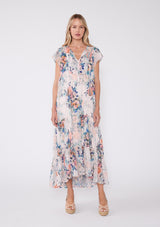 Shop The SaleOur ultra-relaxed bohemian maxi dress is designed in a beautiful pink and blue floral print and features short flutter sleeves and flowy ruffle-trimmed high-low skirt. Dress it up with a a cute wedge for your next special occasion, or pair it with easy boho flat sandals for a relaxed spring/summer outfit.