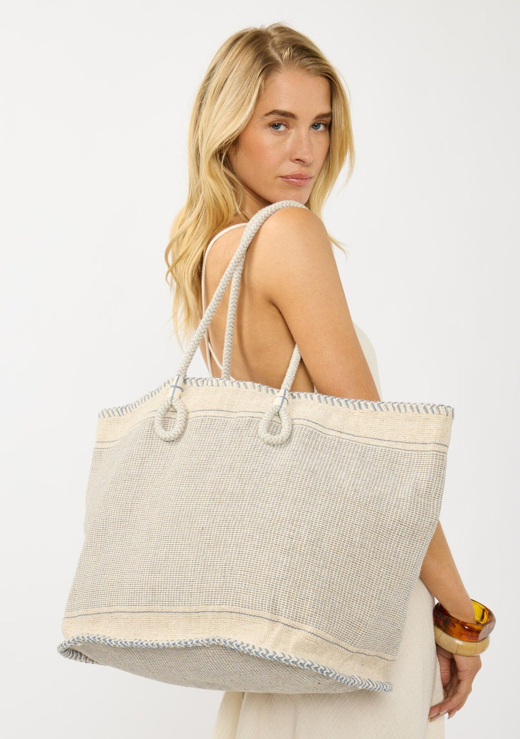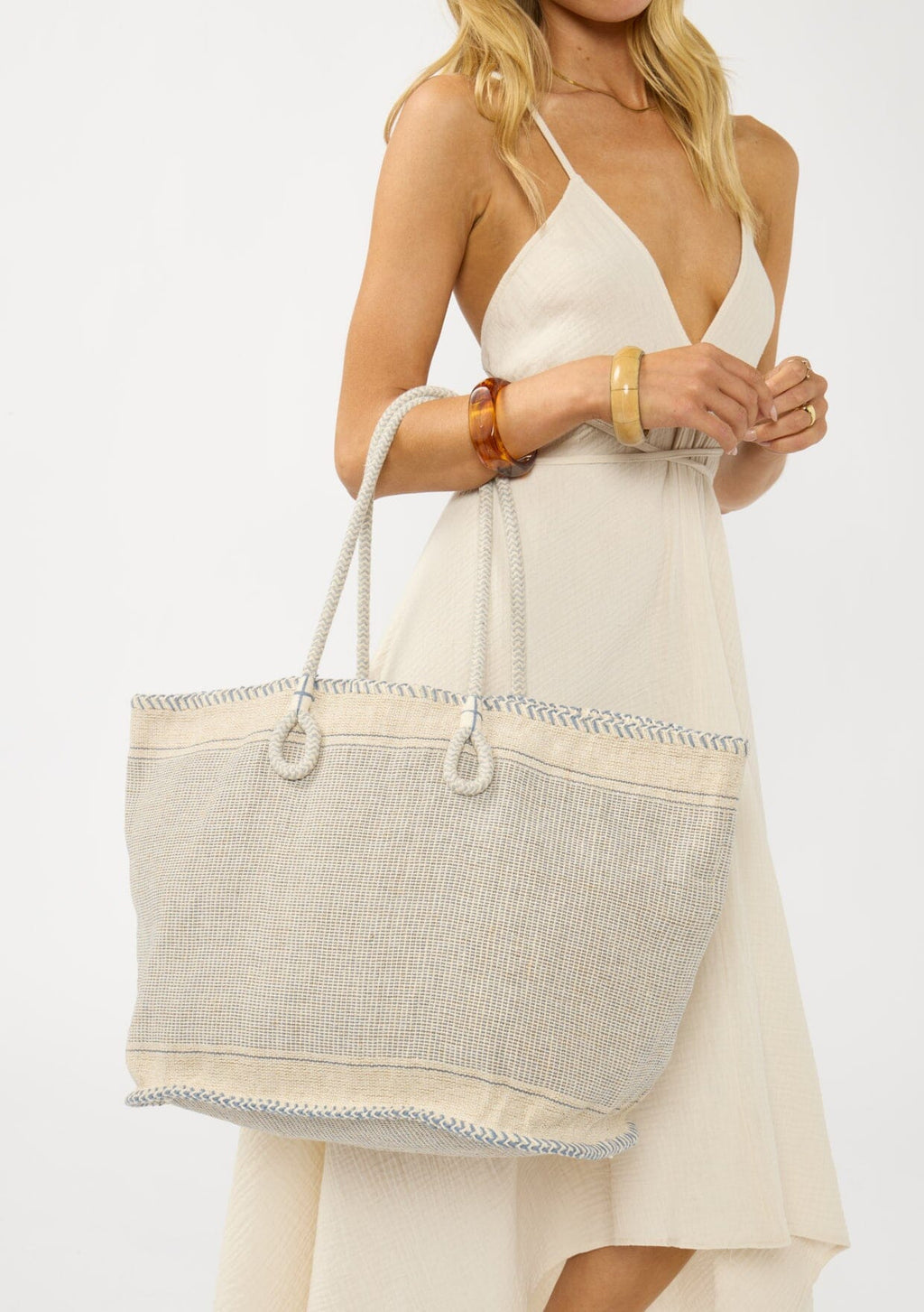 A classic bohemian tote bag with stitched detail throughout and rope handles.
