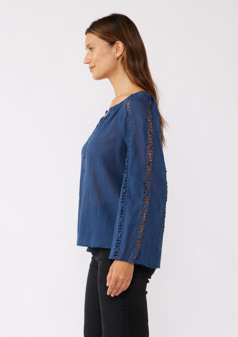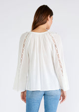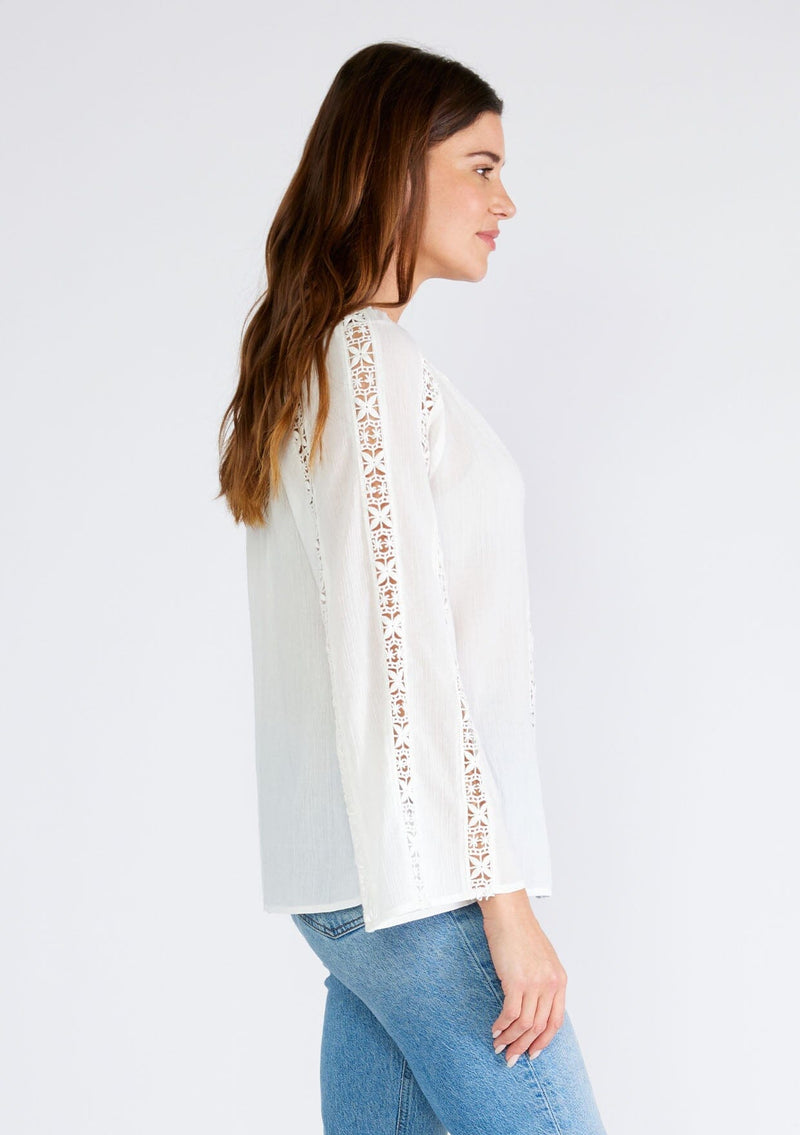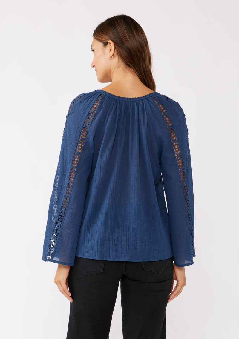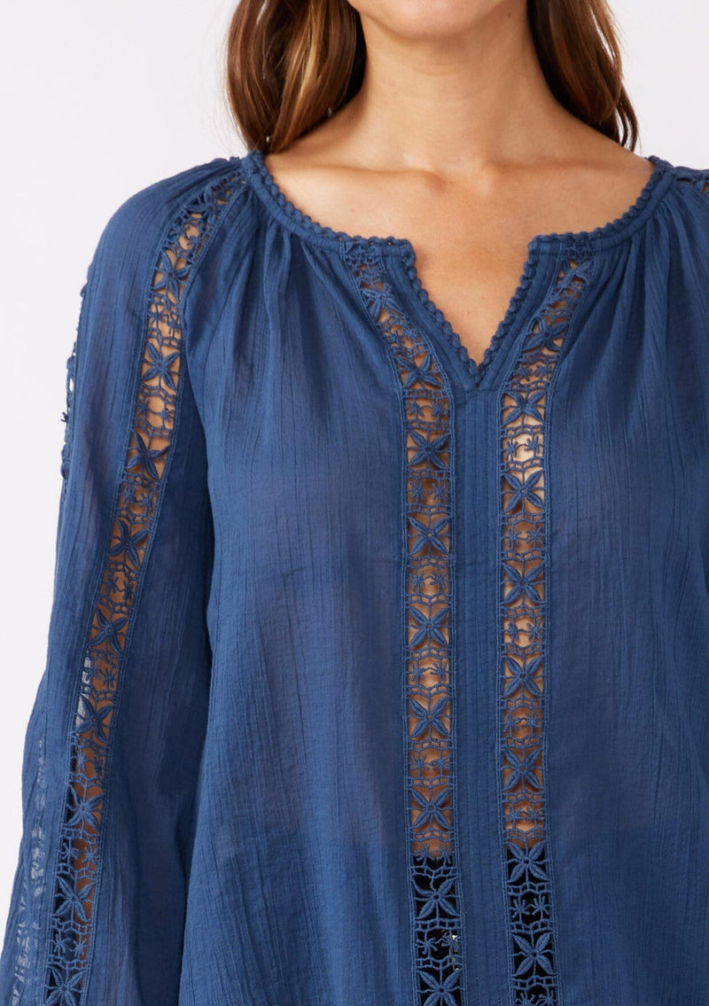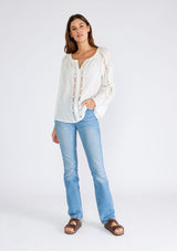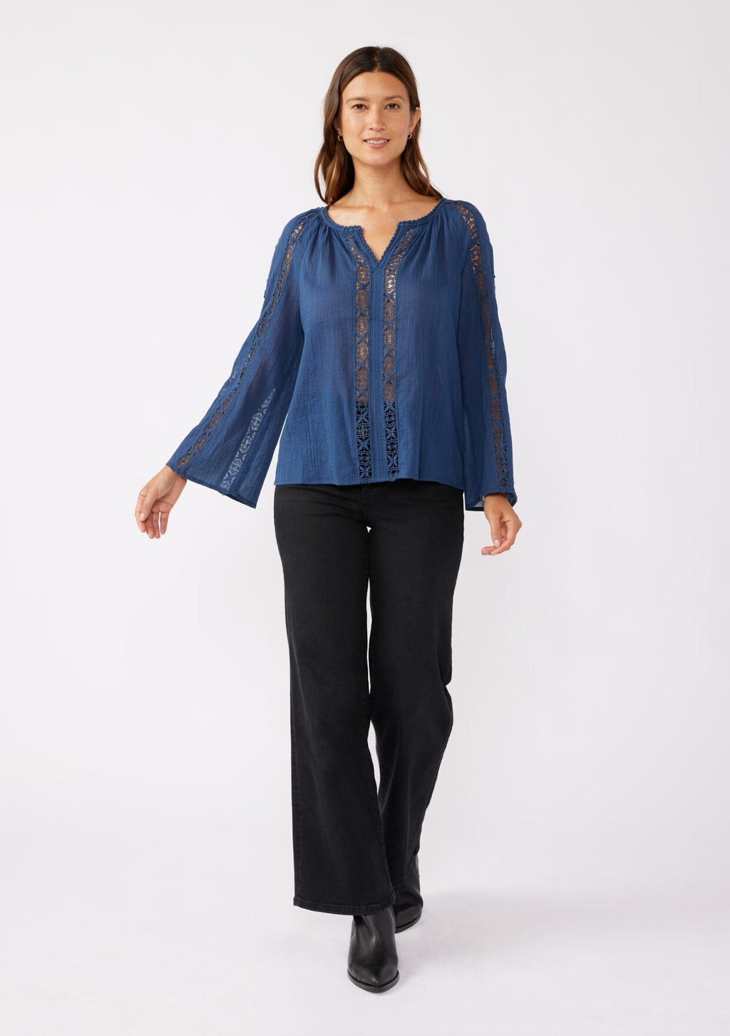 The dreamiest top for any season. This classic bohemian blouse features long bell sleeves, a split v-neckline, and delicate crochet trim throughout. Perfect for warmer weather or layered for cooler days, it pairs beautifully with vintage denim and a simple sandal or boot.