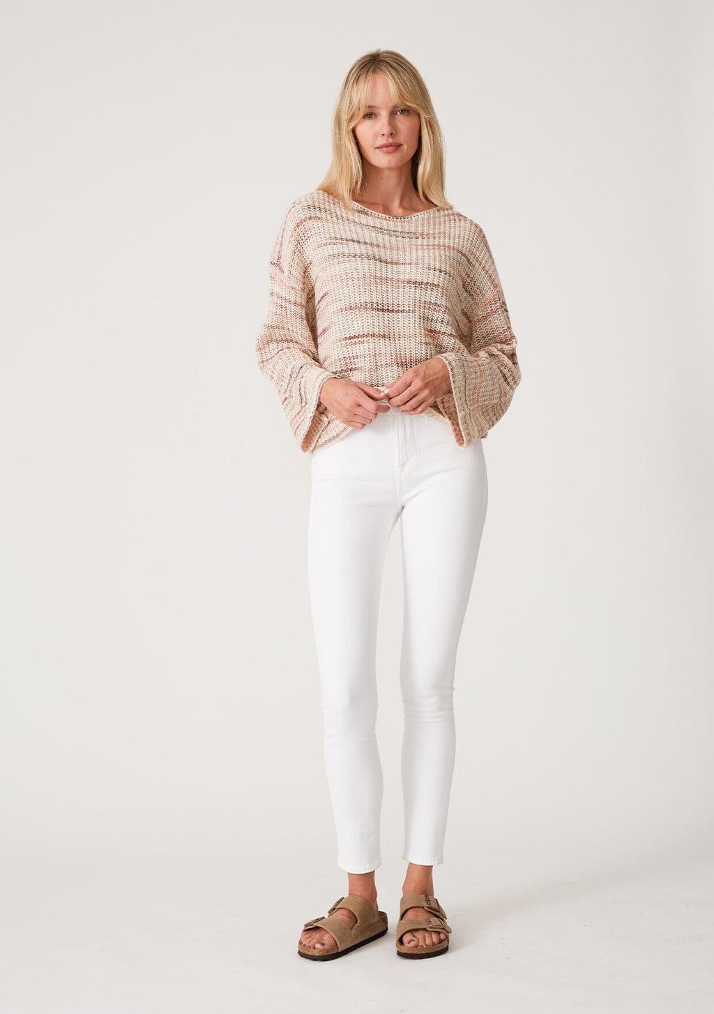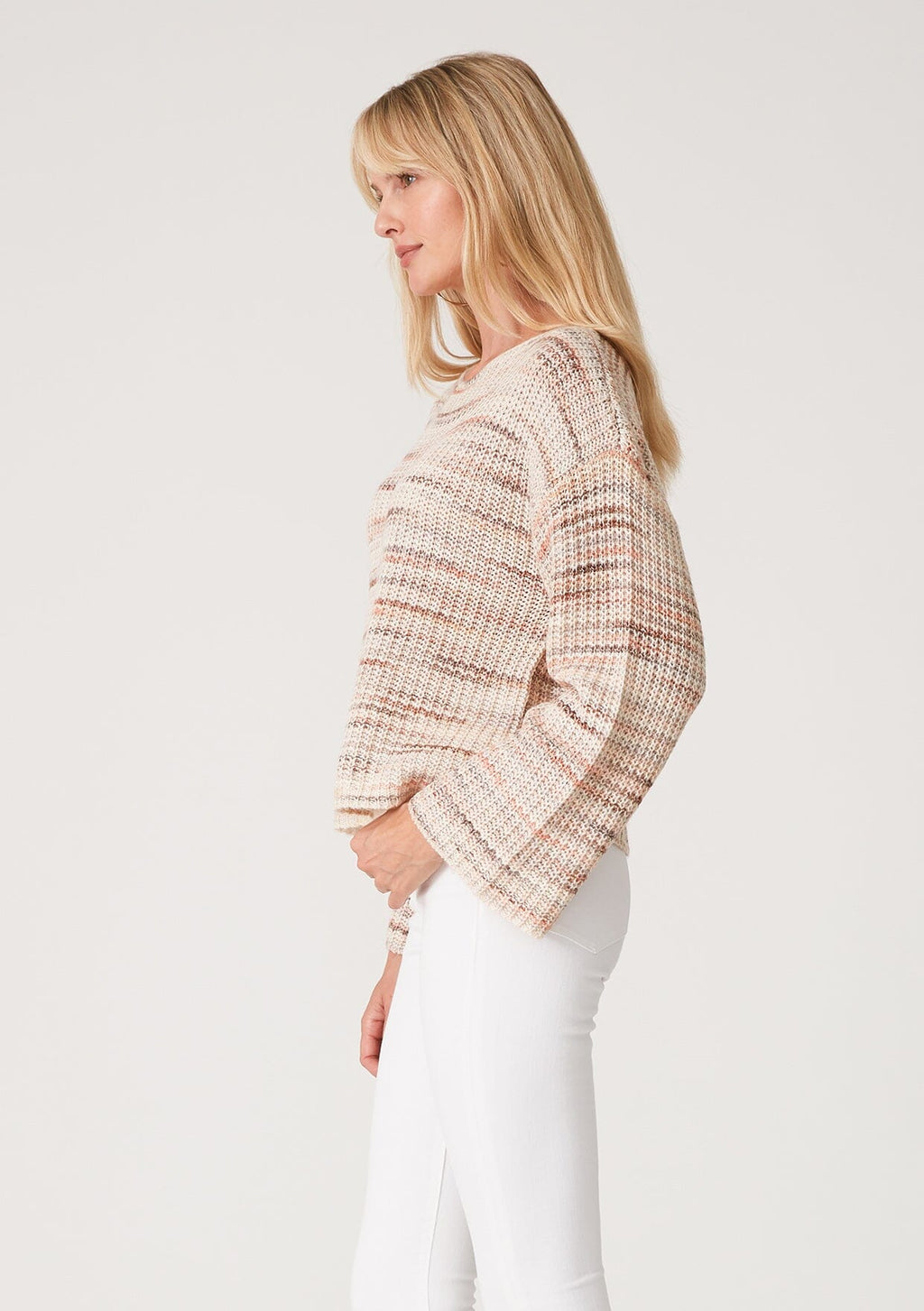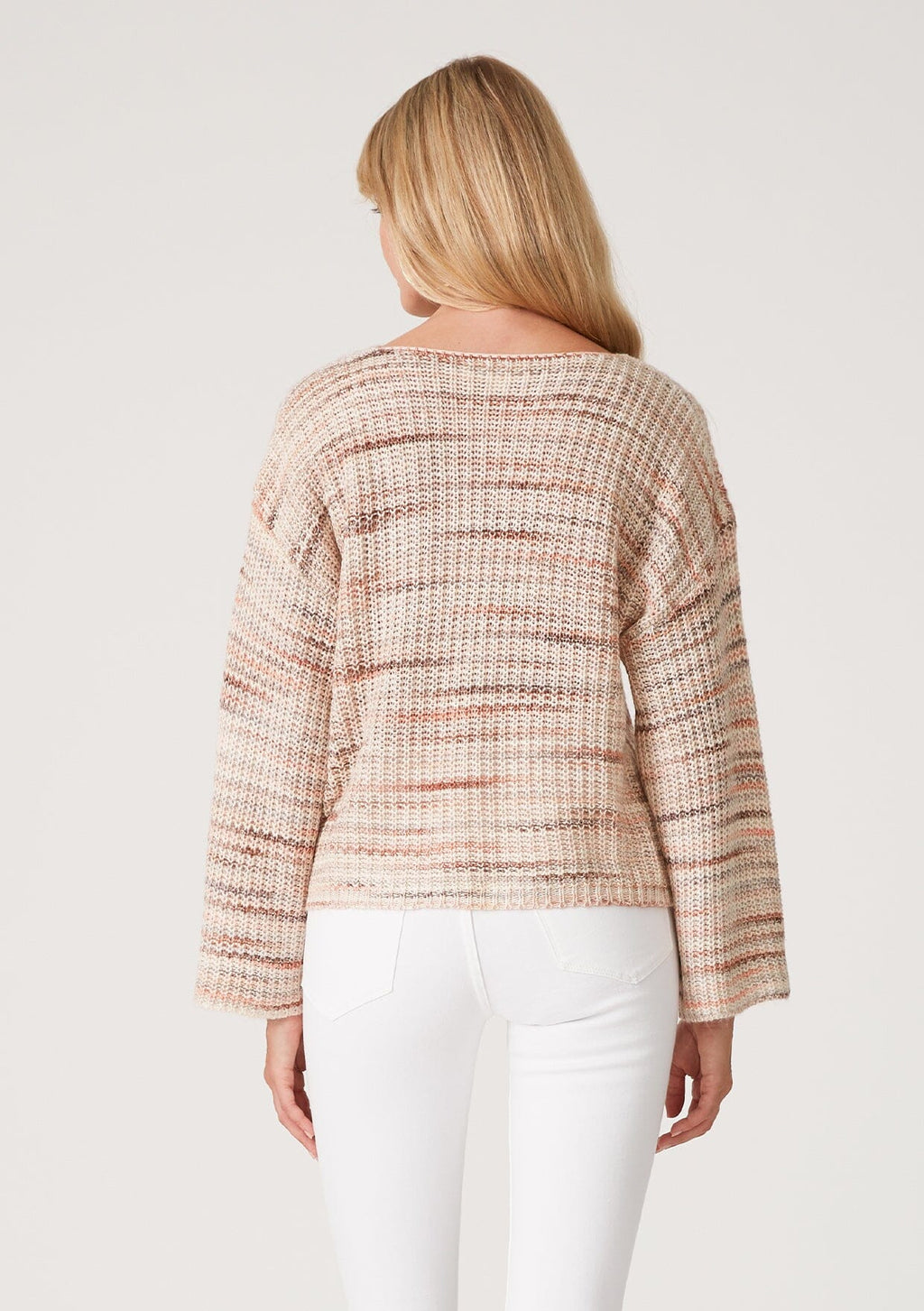 An effortlessly laid-back cropped sweater designed in neutral pink stripes. Knit from a dimensional space-dyed yarn, with long bell sleeves, a flattering boat neckline, and a relaxed dropped shoulder. We love to style this beautiful bohemian fall sweater with our favorite vintage denim.