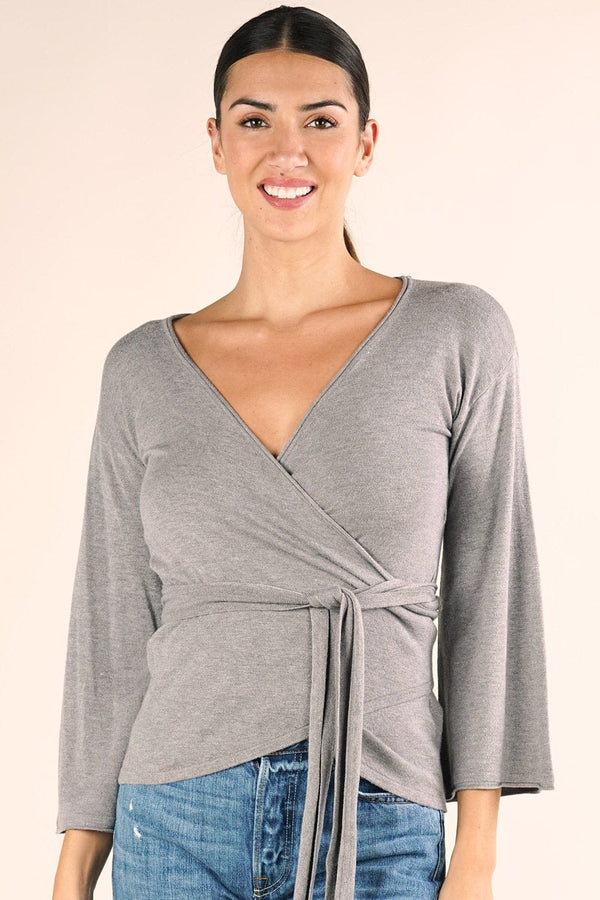 [Color: Heather Ash] A brunette model wearing a casual grey wrap front top with long flowy sleeves, a v neckline, and an adjustable waist tie. [Color: Heather Ash] A brunette model wearing a casual grey wrap front top with long flowy sleeves, a v neckline, and an adjustable waist tie.