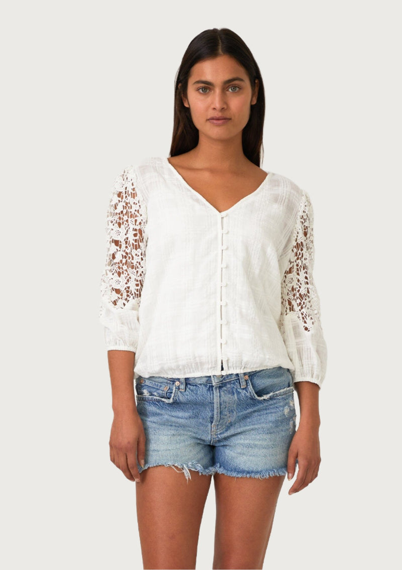 Delicate crochet details add a bohemian touch to this timeless spring blouse. With a flattering v-neckline, a pretty self-covered button front, and warm weather-friendly 3/4 length sleeves. Crafted from a lightweight cotton dobby plaid, we love to pair this effortless style with our favorite vintage denim.