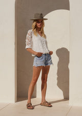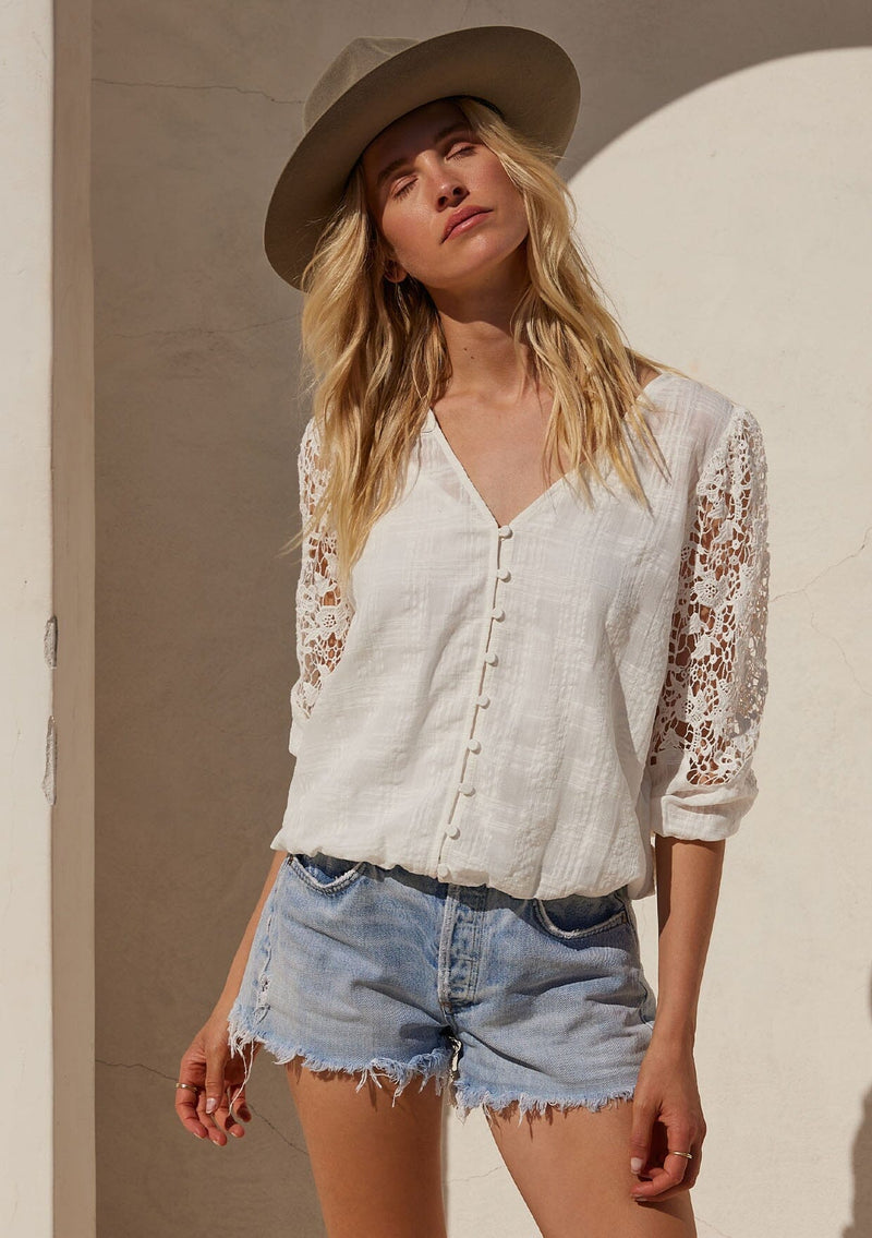 A classic bohemian white blouse with crochet sleeves.