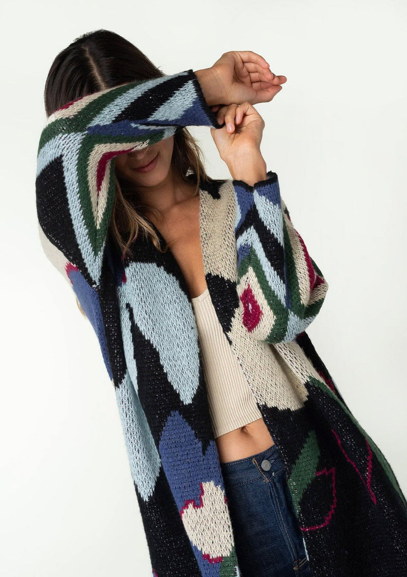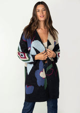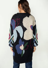 Talk about a statement sweater! An oversize floral jacquard design adds a bold touch to this warm mid-length cardigan. Featuring a soft and cozy hand feel, and an open front. The perfect layering style to instantly elevate any outfit.