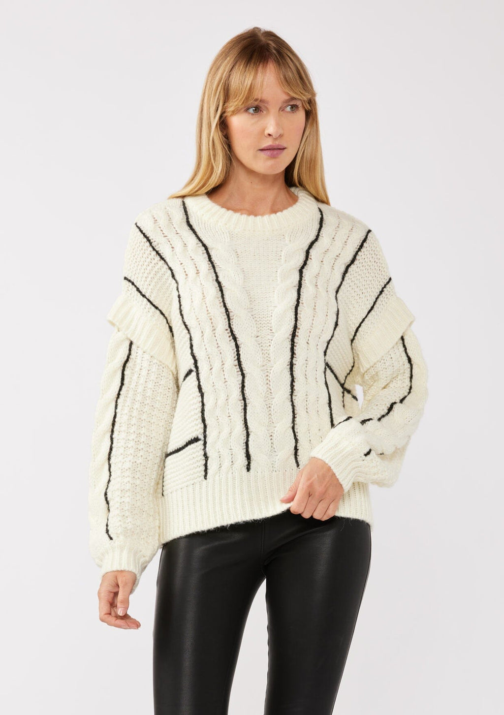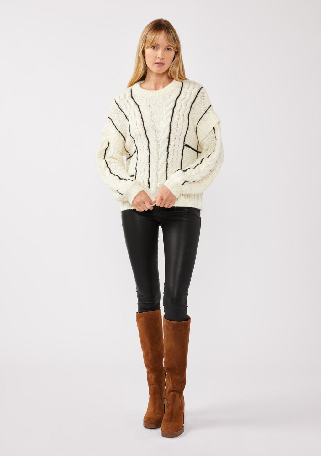 ![[Color: Cream/Black] A full body front facing image of a blonde model wearing a cozy knit sweater with a mixed fabric patchwork and cable knit detailing. This casual sweater features a crew neckline, long sleeves with a dropped shoulder, and a contrasting stripe accent. A cold weather staple for the fall and winter season.](http://www.shoplovestitch.com/cdn/shop/files/092024_222_160x.jpg?v=1758222189)