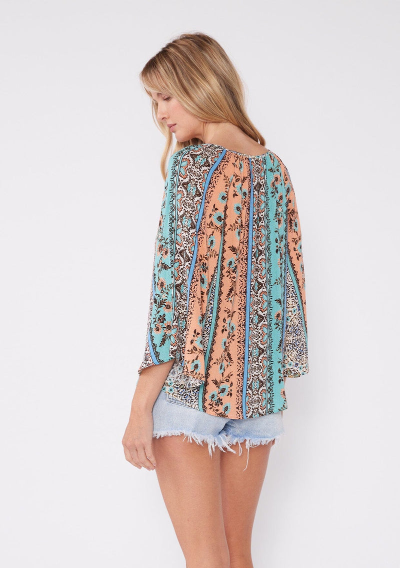 An effortlessly laid-back resort blouse in a bohemian floral patchwork print. Featuring 3/4 wide flutter sleeves, a flattering split v-neckline, and an flowy fit. A must-pack top for your next vacation.