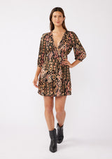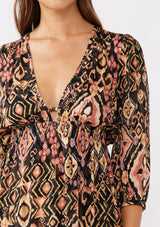 An instant classic, our ultra-bohemian mini dress showcases autumn hues in a standout geometric print. With its trendy plunging v-neckline, empire waistline, and 3/4 length sleeves, this dress combines style and elegance effortlessly. We love pairing it with Western boots and simple gold jewelry for an effortless fall boho look.