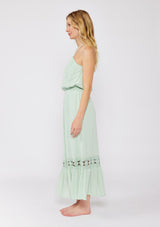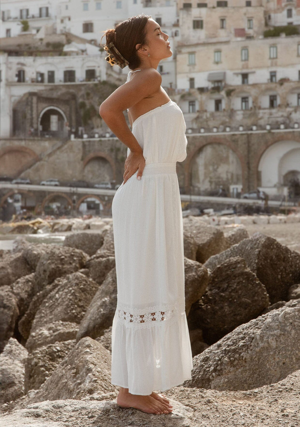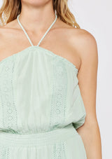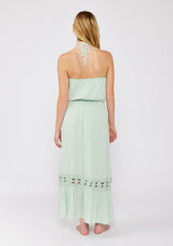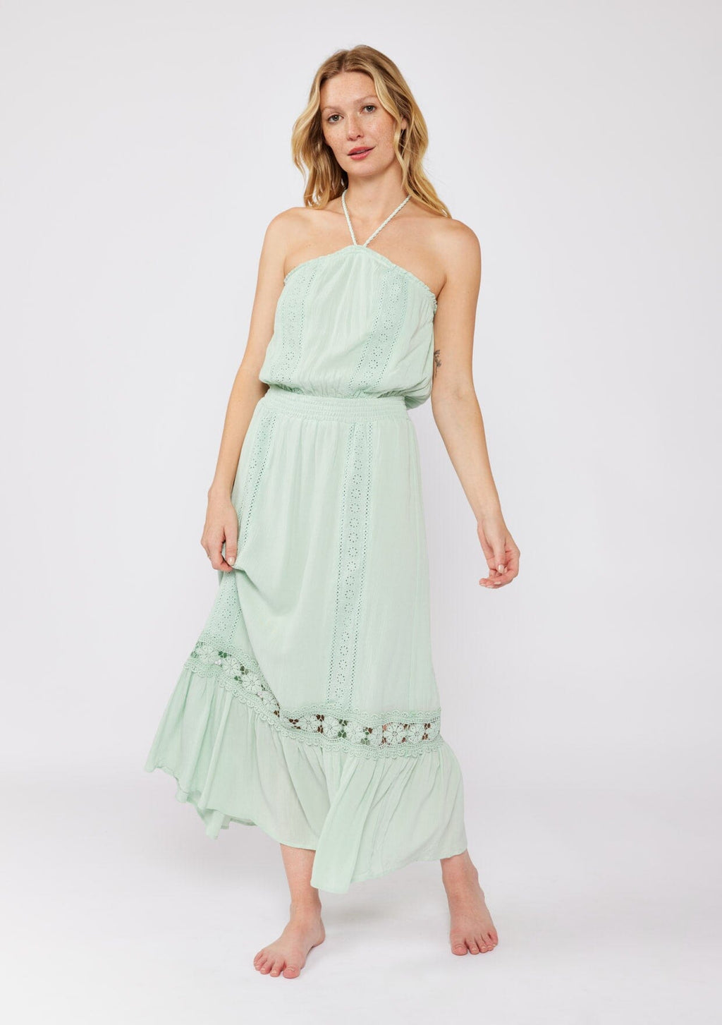 Classic bohemian halter maxi dress with a smocked waist detail and a delicate lace design.