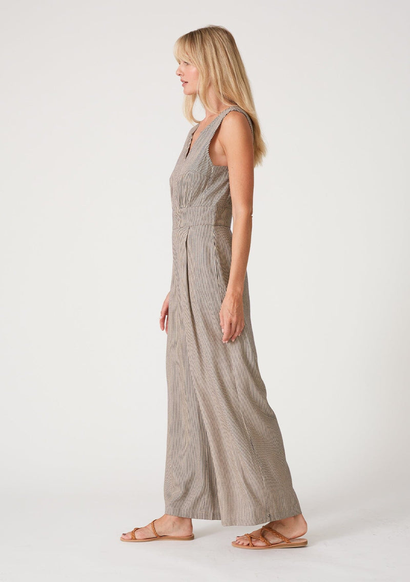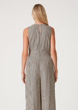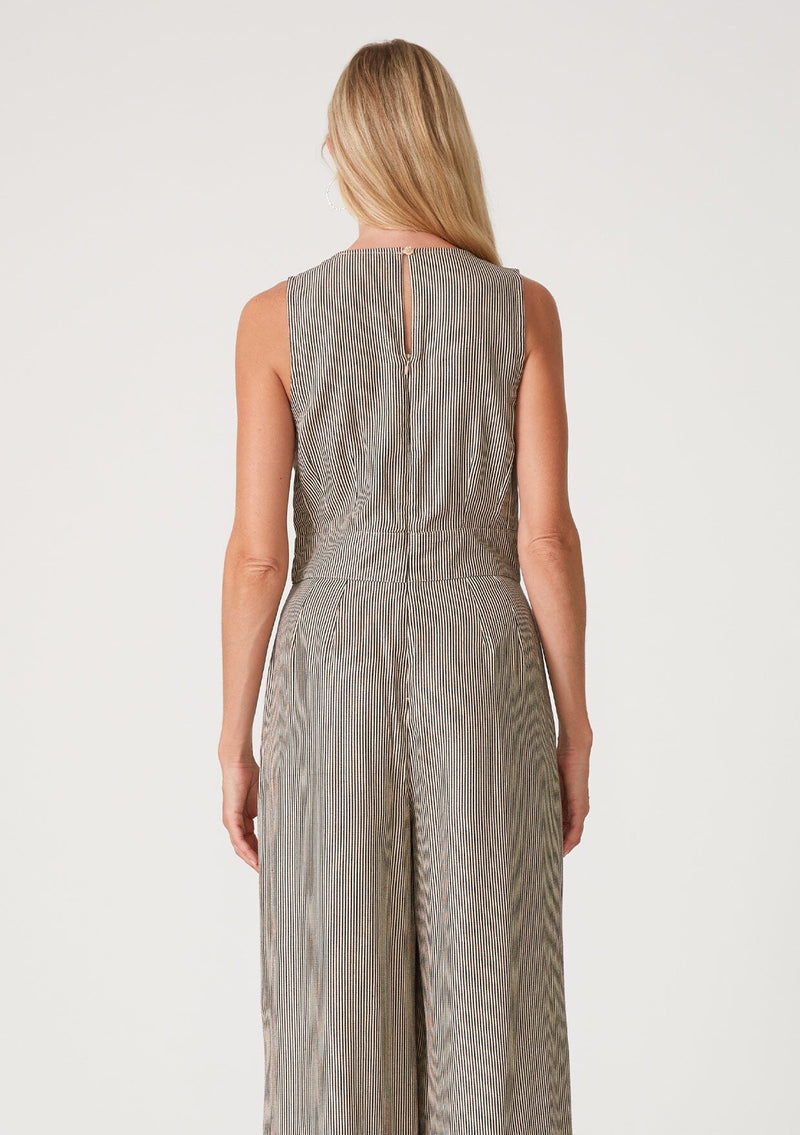 Shop The SaleA cool sleeveless wide-leg jumpsuit designed in a taupe and navy blue stripe.