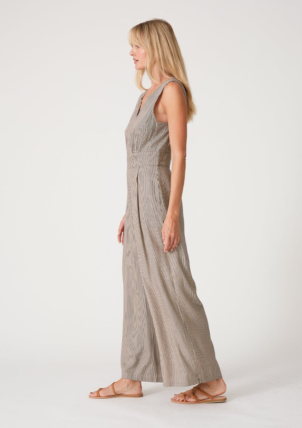 The perfect alternative to a maxi dress, our sleeveless jumpsuit is designed in a chic micro stripe. With a long wide leg, essential side pockets, and a relaxed fit. A versatile style for any season, we love to pair it with sandals in the spring and summer, or warm it up with a boot for fall.