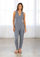 Staying cozy never looked so good! Our soft french terry sleeveless jumpsuit features a flattering v-neckline, essential side patch pockets, and contrast ribbed trim detail throughout. Wear it on its own for lounging at home, or try it layered over a tee with a sweatshirt for an effortlessly casual Fall vibe.