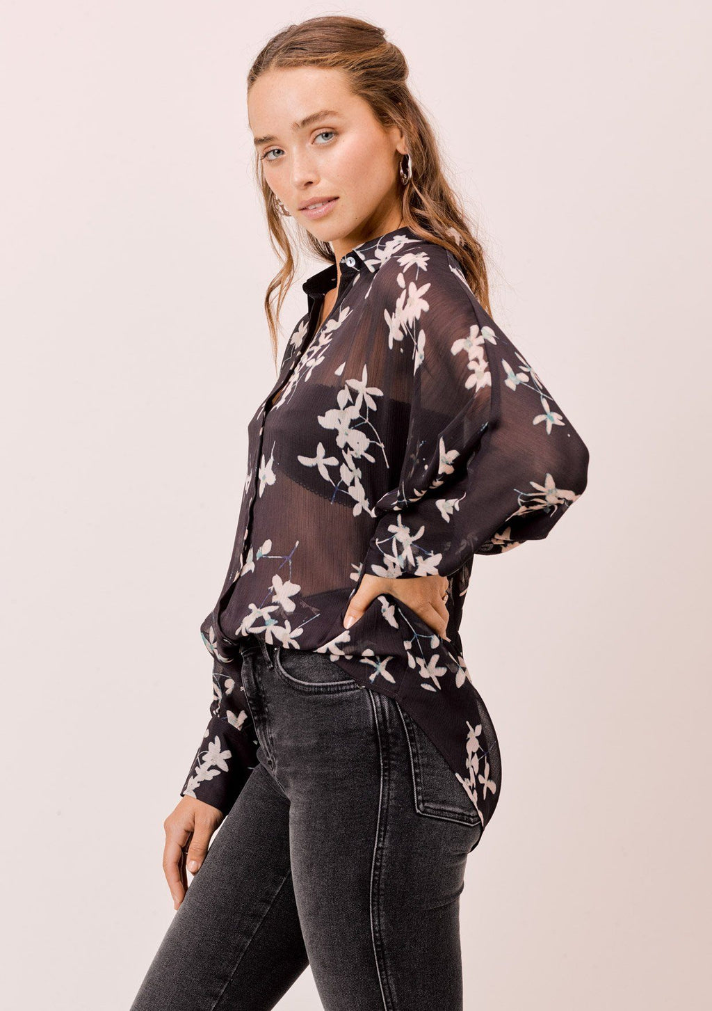 Perfect for day or night, our versatile floral chiffon top has you covered! Shown here with a camisole, this sultry sheer button-up shirt looks great with a cami underneath or a bralette for nights out on the town.