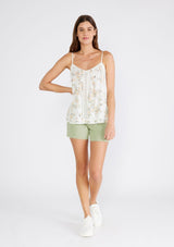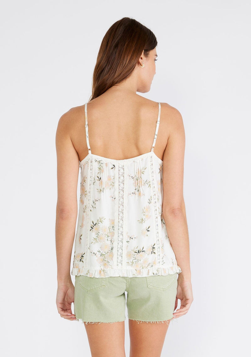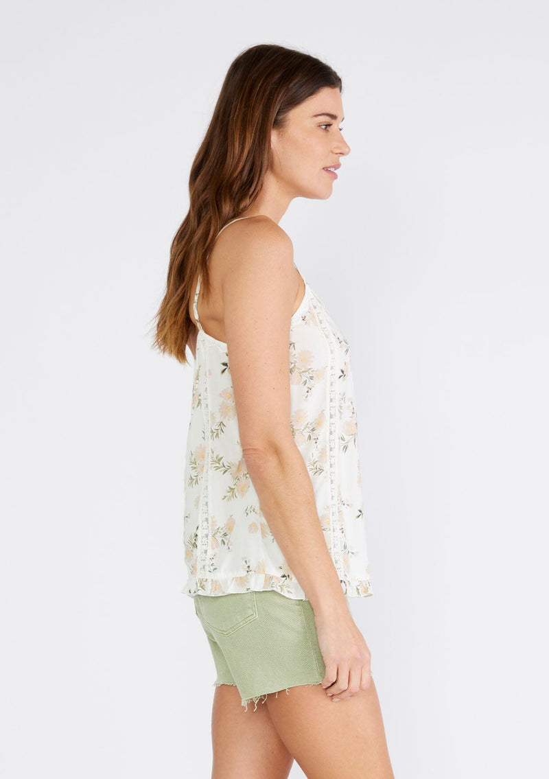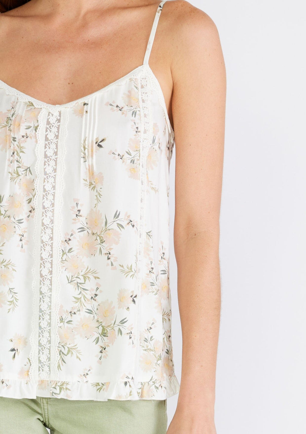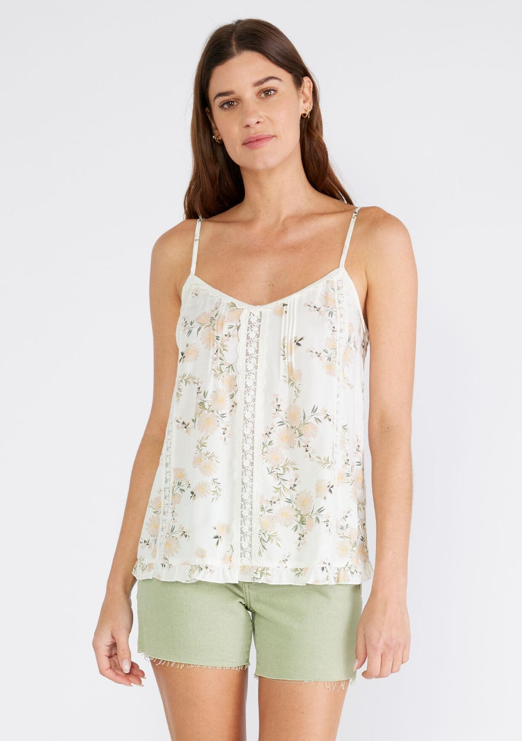 An ultra-pretty lace-trimmed camisole designed in an ivory and pink floral print.