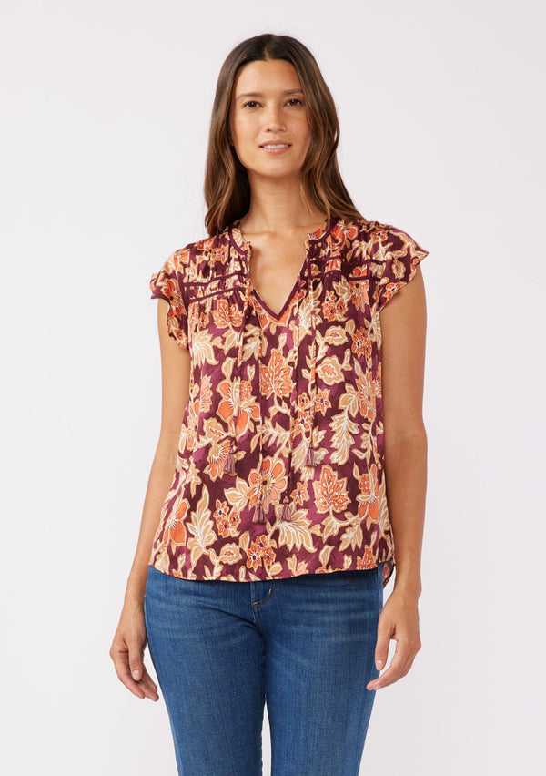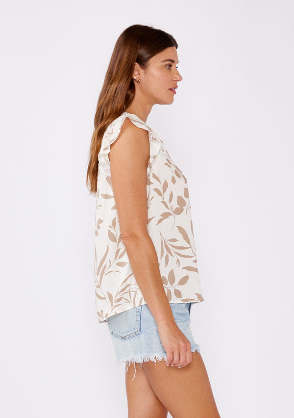[Bone/Lilac] This top features a delicate floral and foliage print in shades of lilac on a bone-colored background. Made from lightweight fabric, it has a deep V-neckline with a small center keyhole detail, adding a hint of allure. The cap sleeves and gathered waistband create a flattering silhouette, making this top perfect for both casual and evening wear. Its nature-inspired charm is ideal for a spring or summer wardrobe.[Bone/Lilac] This top features a delicate floral and foliage print in shades of lilac on a bone-colored background. Made from lightweight fabric, it has a deep V-neckline with a small center keyhole detail, adding a hint of allure. The cap sleeves and gathered waistband create a flattering silhouette, making this top perfect for both casual and evening wear. Its nature-inspired charm is ideal for a spring or summer wardrobe.