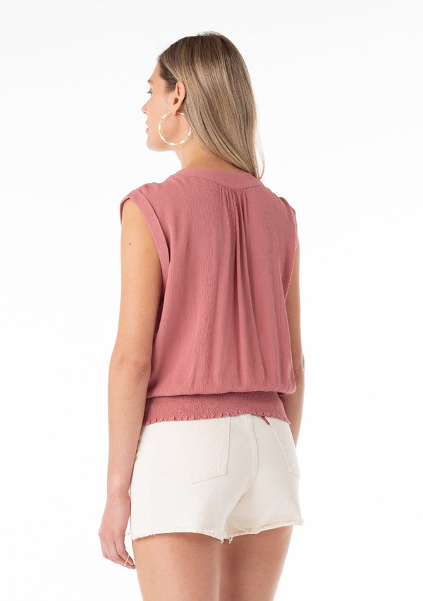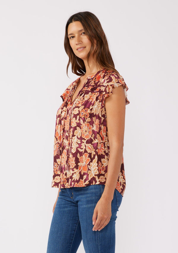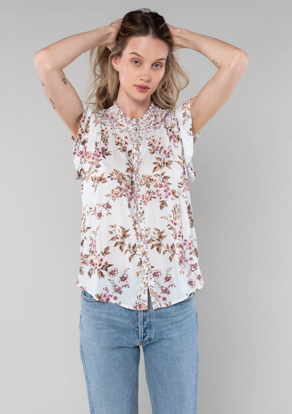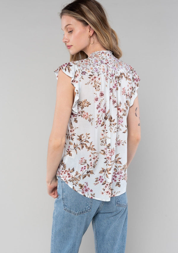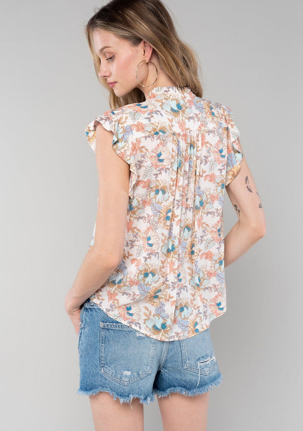 [Color: Natural/Pink] A close up front facing image of a blonde model wearing a lightweight bohemian spring peplum top in a pink floral print. With short ruffled sleeves, a ruffle trimmed v neckline, a self covered button front, and an adjustable drawstring waist with a tie. [Color: Natural/Pink] This lightweight bohemian spring top is the perfect addition to your wardrobe for sunny days. With a delicate floral print and short ruffled sleeves, this classic Lovestitch top exudes a free-spirited and carefree vibe. The feminine silhouette can be dressed up or down, with an adjustable drawstring waist for versatility, a deep v-neckline and delicate pink and yellow floral print. Available in XS through XL.