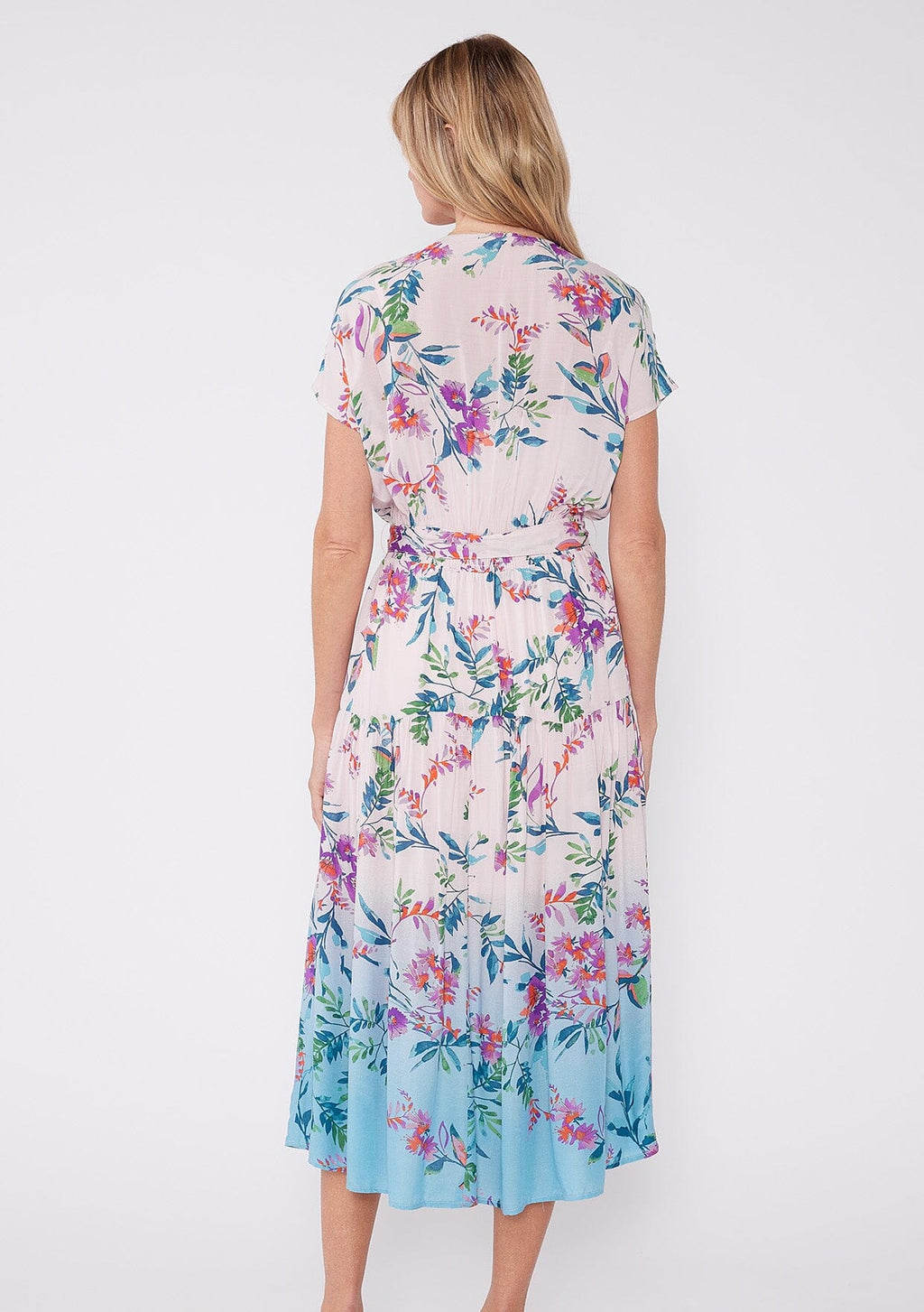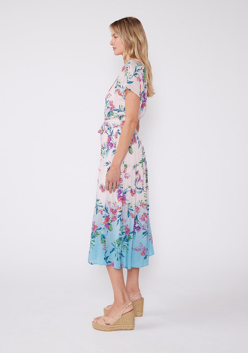 We love the soft hand-feel of our newest classic belted maxi dress! The adjustable belted waist detail offers a custom flattering fit, while the surplice v-neckline offers an elegant touch. The blue and pink ombre ground is brought to life with a stunning botanical floral print. The perfect dress for a wedding guest, gender reveal party, or a sunny casual summer day! Dress it up with chic summer wedges, or pair it with your favorite white sneakers for a playful casual look!
