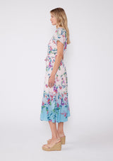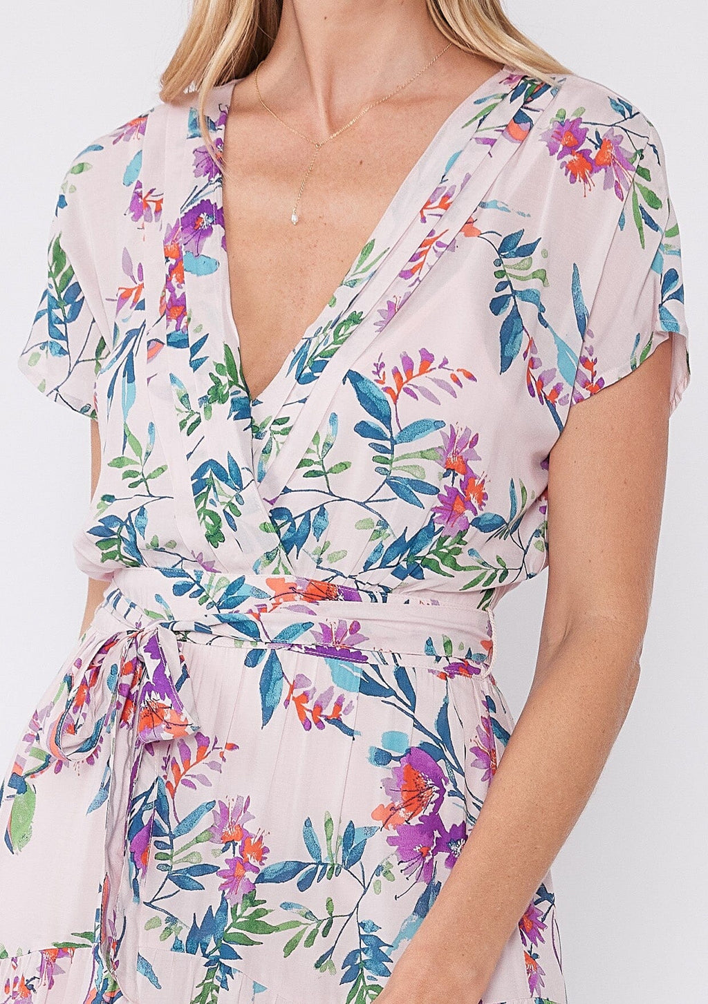 A flowy, soft pink blue floral print maxi featuring short relaxed sleeves, a surplice deep v-neckline, belted waist and flattering relaxed fit.