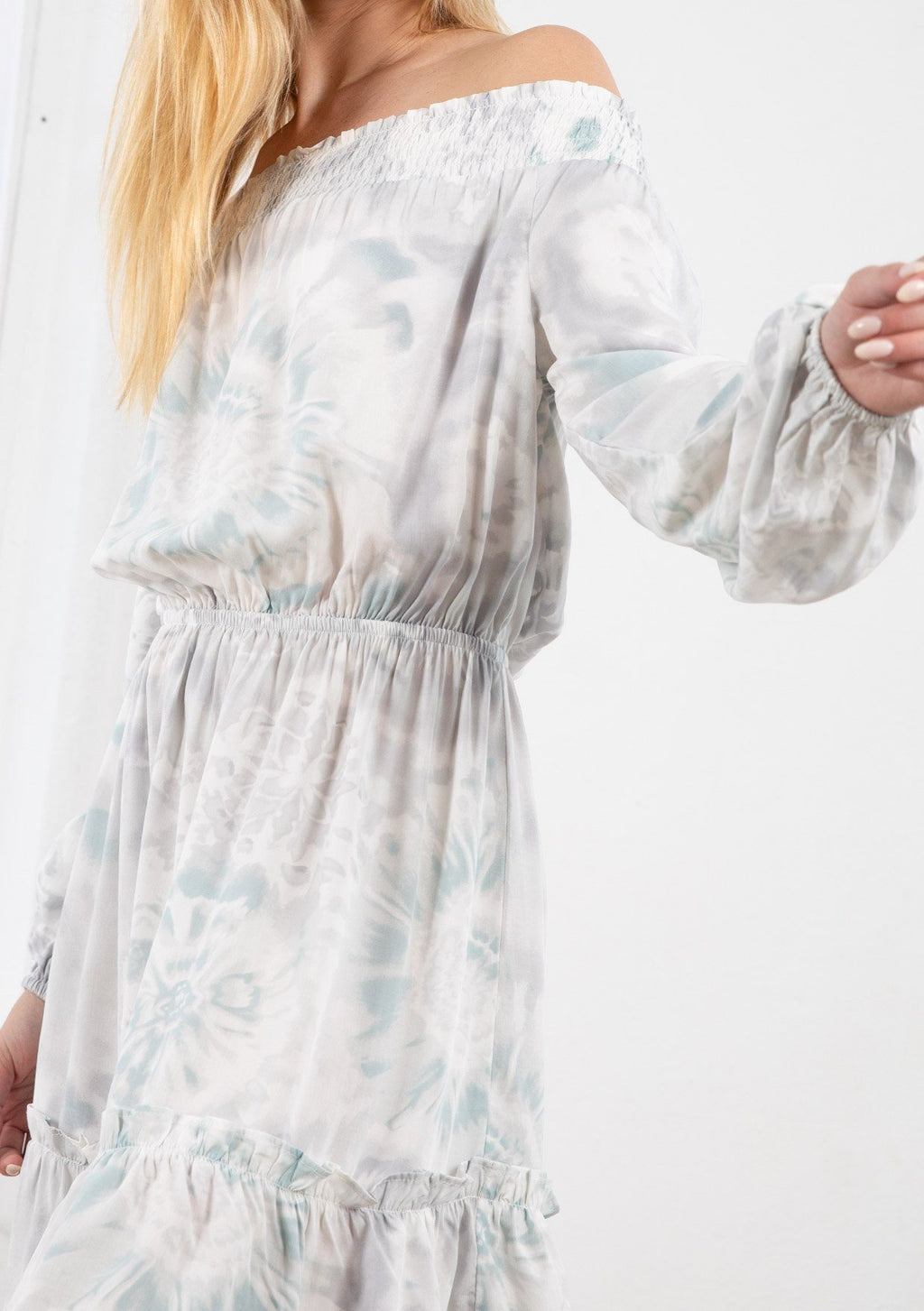 Soak up the sun this Summer in our ultra-bohemian off-the-shoulder mini dress in a soft tie-dye print. Featuring a smocked elastic neckline, an elastic waist, and long voluminous sleeves with an elastic cuff. A versatile style that pairs well with sandals or tennis shoes.