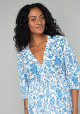 A flowy bohemian maxi dress in a white and blue floral print, with a smocked waist detail.