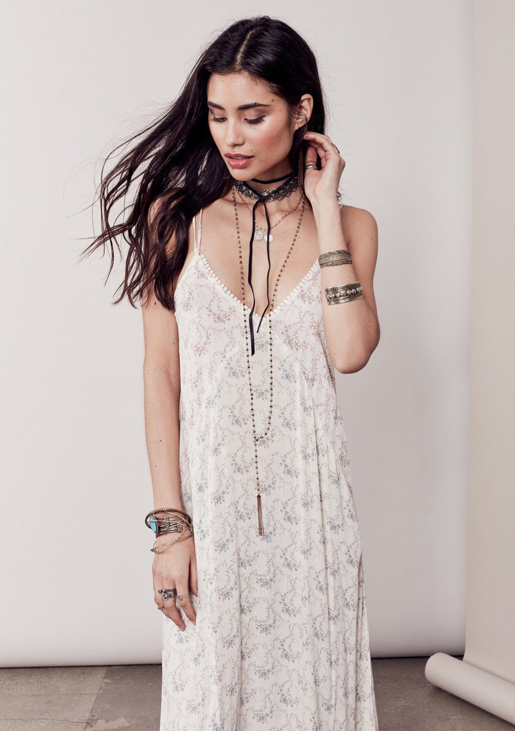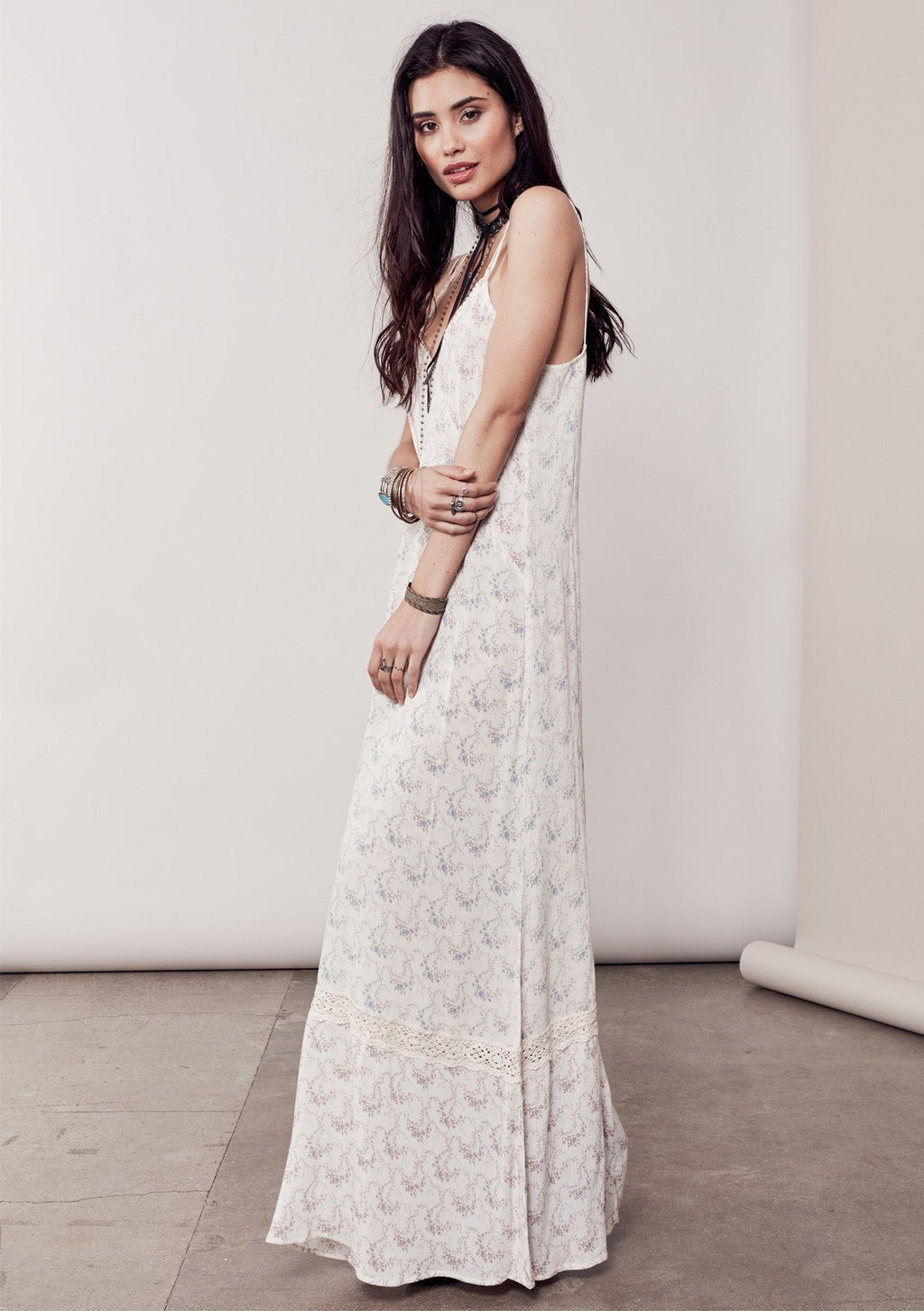 A romantic staple made to complete your boho closet. This vintage-inspired slip-style maxi dress blooms in a ditsy floral patchwork print. Delicate lace trim and crochet insets add a touch of romance, while the strappy open back keeps it effortlessly boho. A statement piece made for casual, laid back days.