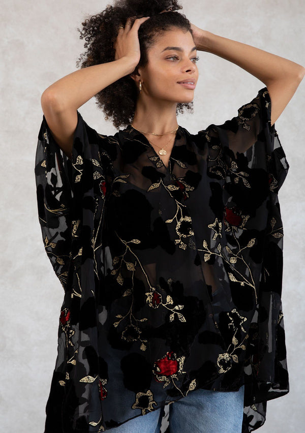 [Color: RedFloral/Black] A model wearing a holiday ready bohemian velvet kimono in black and red floral. With gold thread design, an open front, and half length sleeves. [Color: RedFloral/Black] A model wearing a holiday ready bohemian velvet kimono in black and red floral. With gold thread design, an open front, and half length sleeves.