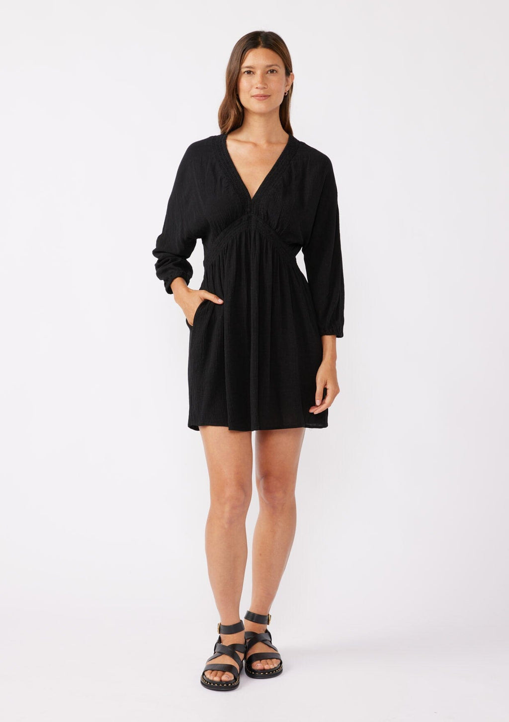 A relaxed silhouette with classic bohemian billowy sleeves and convenient side pockets. Featuring a flattering smocked trim v-neckline, with the smocking extending around the waistline for added comfort and style. Whether you're heading to an early farmers market or enjoying a casual outing with friends, this versatile mini is your go-to for effortless styling.
