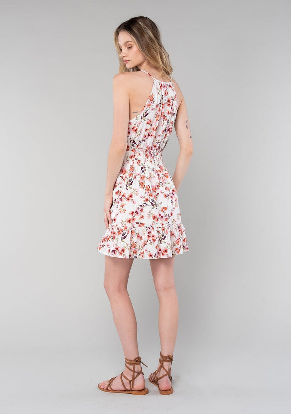 [Color: Natural/Rose] A back facing image of a blonde model wearing a bohemian spring mini dress in a rose pink floral print. With spaghetti straps, a split v neckline with tassel ties, a smocked elastic waist, and a flowy tiered skirt.[Color: Natural/Rose] A front facing image of a blonde model wearing a bohemian spring mini dress in a rose pink floral print. With spaghetti straps, a split v neckline with tassel ties, a smocked elastic waist, and a flowy tiered skirt.