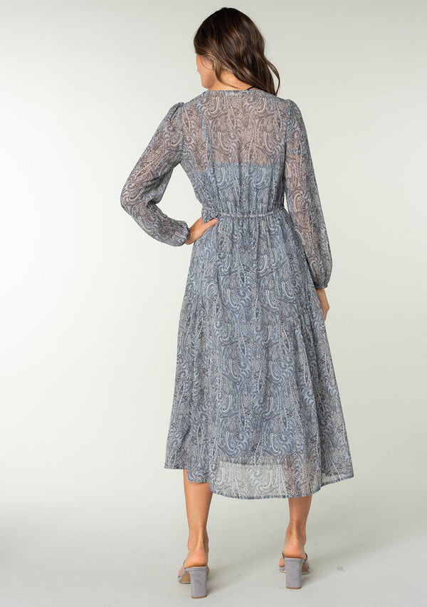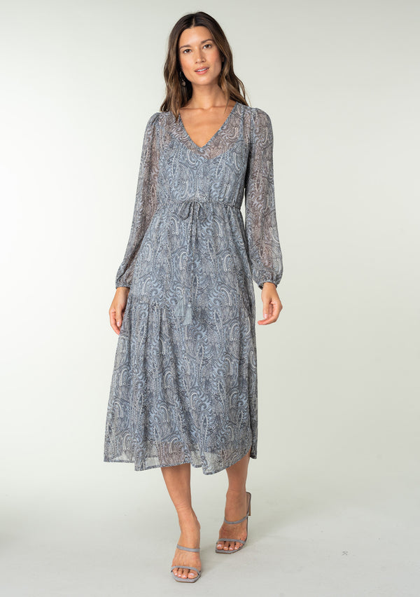 [Color: Grey/Natural] A full body front facing image of a brunette model wearing a sheer chiffon maxi dress in a grey and natural paisley print. With sheer long sleeves, a drawstring waist with tassel ties, a v neckline, and a paneled tiered flowy skirt. [Color: Grey/Natural] A front facing image of a brunette model wearing a sheer chiffon maxi dress in a grey and natural paisley print. With sheer long sleeves, a drawstring waist with tassel ties, a v neckline, and a paneled tiered flowy skirt.