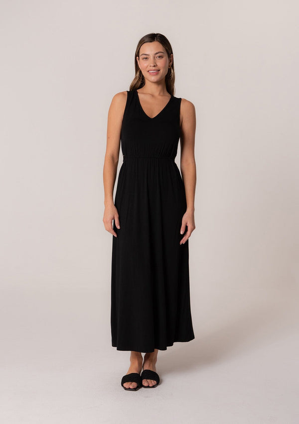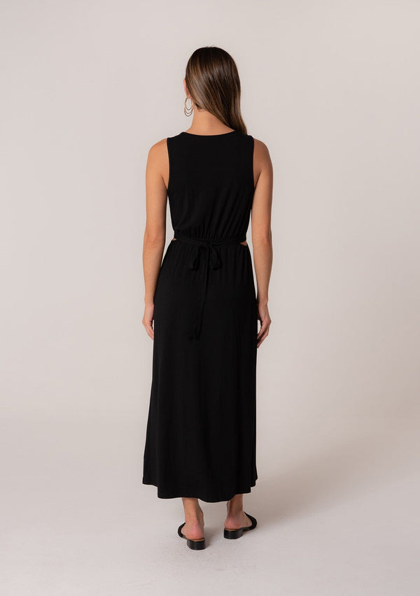 [Color: Black] A back facing image of a brunette model wearing a soft and stretchy knit sleeveless maxi dress in black. With a v neckline, sexy side waist cutouts, and a self tie belt. [Color: Black] A front facing image of a brunette model wearing a soft and stretchy knit sleeveless maxi dress in black. With a v neckline, sexy side waist cutouts, and a self tie belt.