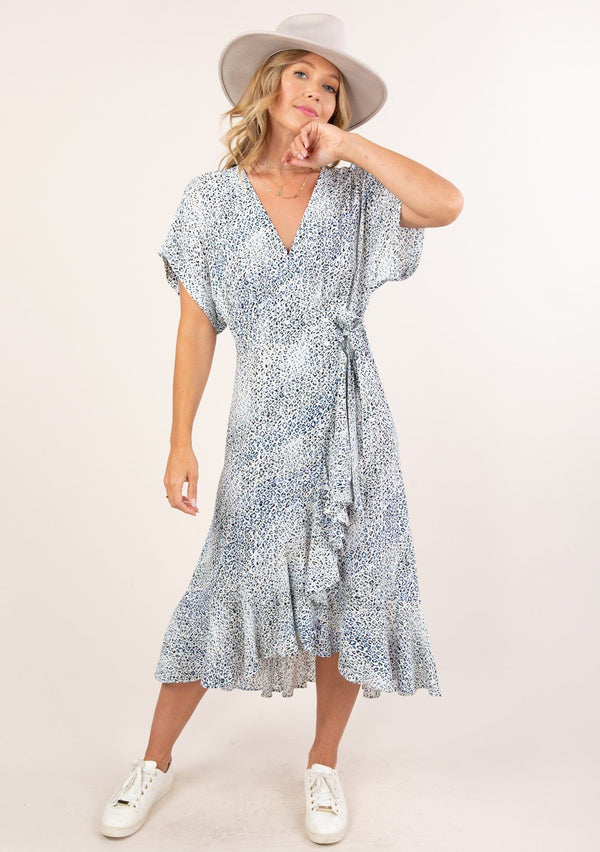 [Color: Safari/Lagoon] Lovestitch watercolor animal print, v-neck dress with front slits and self tie belt. [Color: Safari/Lagoon] Lovestitch watercolor animal print, v-neck dress with front slits and self tie belt.