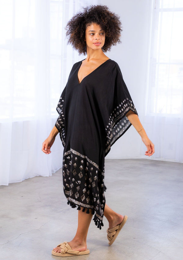 ![[Color: Black] A model wearing a block print caftan. With a v neckline in front and back and a tassel trim.](http://www.shoplovestitch.com/cdn/shop/products/i-70463W-PIWtasseltrimbeachcaftanwithborderprintdetail_0013_StudioSession-Gabby-1553_{width}x.jpg?v=1748476193)