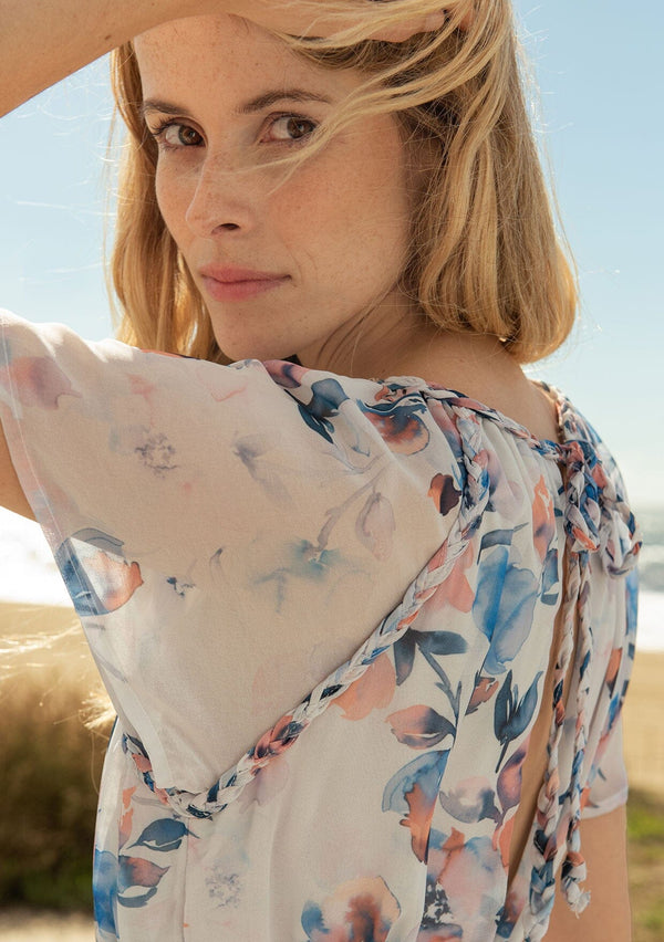 [Color: Ivory/Blue] A back facing image of a blonde model wearing a sheer floral print mini dress. With short flounce sleeves, a braided trim throughout, an open back with braided rope tie, and a smocked elastic waist.[Color: Ivory/Blue] A front facing image of a blonde model wearing a sheer floral print mini dress. With short flounce sleeves, a braided trim throughout, an open back with braided rope tie, and a smocked elastic waist.