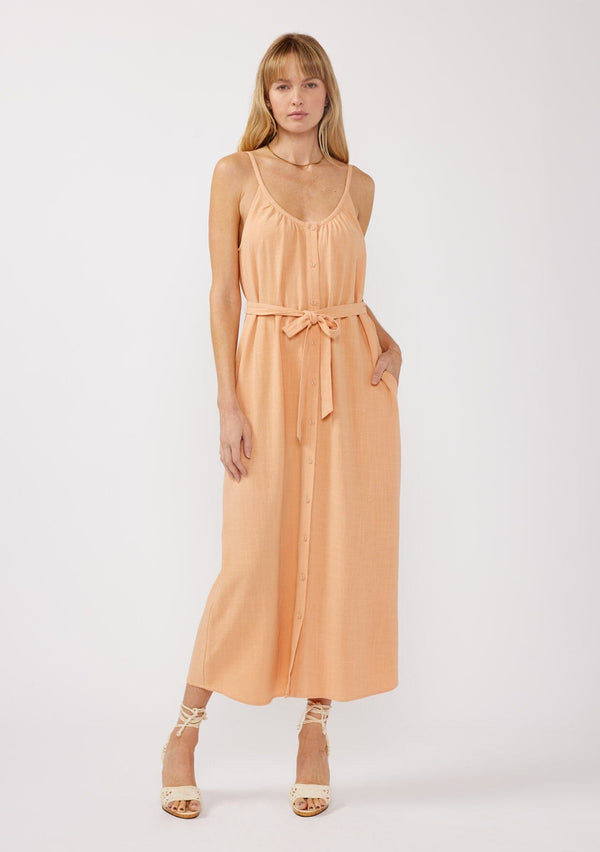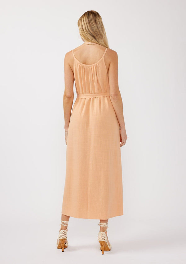 ![[Color: Apricot] A back facing image of a blonde model wearing an light orange sleeveless maxi dress with an adjustable waist belt, button front, a scoop neckline, and side pockets. A relaxed fit maxi dress with a linen blend texture.](http://www.shoplovestitch.com/cdn/shop/files/133_{width}x.jpg?v=1748478159)