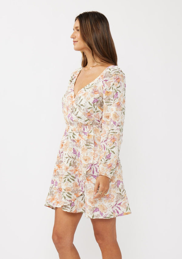 ![[Color: Cream/Dusty Lilac] A side facing image of a brunette model wearing a floral faux wrap mini dress with a puckered texture. Featuring a surplice v-neckline, long sleeves, elastic cuffs, and elastic shoulders.](http://www.shoplovestitch.com/cdn/shop/files/Lovestitch_12132024_489_{width}x.jpg?v=1748477887)