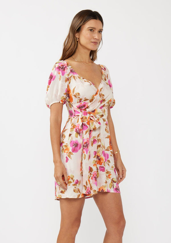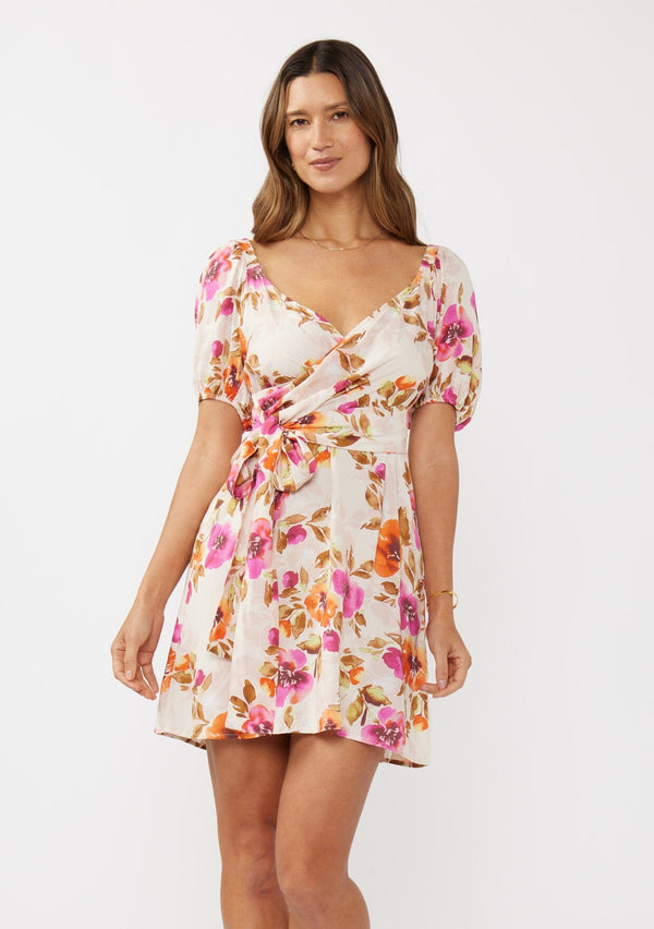 ![[Color: Natural/Orchid] A side facing image of a brunette model wearing a pretty floral mini dress in pink and orange. With a surplice v neckline, puff sleeves, attached waist belt with multiple styling opportunities, and smocked back. A cute floral dress for special occasions and dinner parties.](http://www.shoplovestitch.com/cdn/shop/files/Lovestitch_20250113_103_{width}x.jpg?v=1748479042)