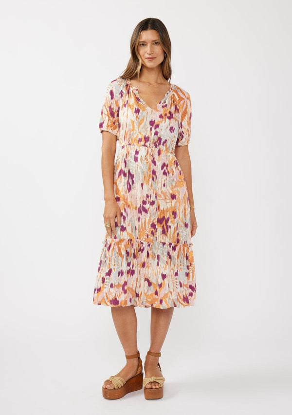 ![[Color: Natural/Plum] A side facing image of a brunette model wearing an orange and purple midi dress with an abstract ikat print. A standout bohemian midi dress with short puff sleeves, split v neckline, drawstring waist, and a ruffle trimmed hem. A versatile midi dress styled with chucky clogs for the perfect boho chic look.](http://www.shoplovestitch.com/cdn/shop/files/Lovestitch_20250113_118_{width}x.jpg?v=1748479014)