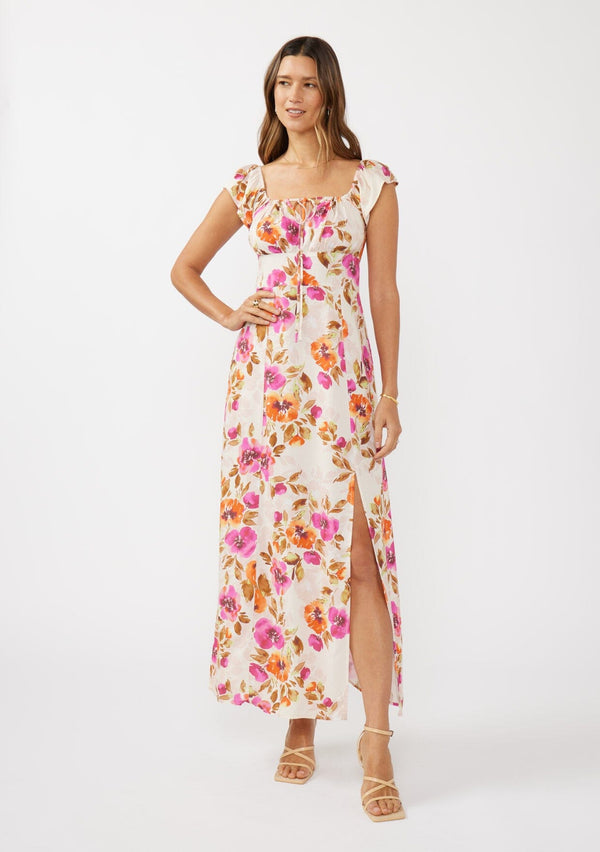![[Color: Natural/Orchid] A side facing image of a brunette model wearing a large floral print maxi dress in orange and pink florals. With a square neckline, tie front neckline detail, smocked back, flutter cap sleeves, and a side slit. A pretty spring and fall maxi dress paired with strappy sandals.](http://www.shoplovestitch.com/cdn/shop/files/Lovestitch_20250113_98_{width}x.jpg?v=1748479040)