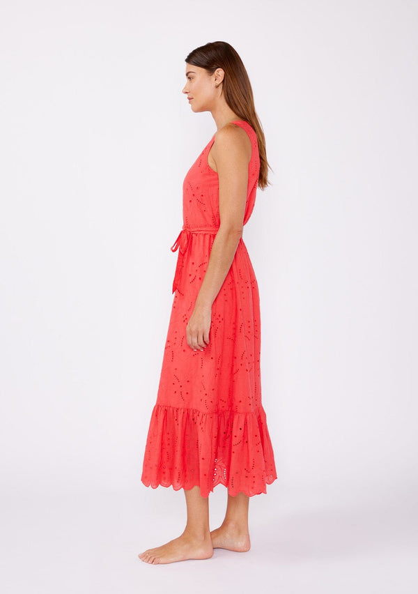 ![[Color: Coral] A brunette woman wearing a bright coral midi dress with embroidered eyelet details. With a sleeveless design, v neckline, adjustable waist belt, open back with button closure, and a ruffle trimmed hem.](http://www.shoplovestitch.com/cdn/shop/files/brightredeyeletdetailsleevelessdresswithvneckandbeltedwaist_0002_05082024_Lovestitch_615_{width}x.jpg?v=1748479168)