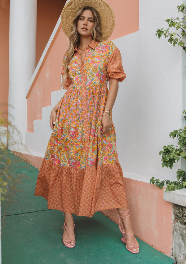 ![[Color: Pink/Mango] A woman wearing a flowy cotton bohemian maxi dress in a bright pink and yellow mixed floral print. With half length puff sleeves, a collared neckline and a button front.](http://www.shoplovestitch.com/cdn/shop/products/I-72800W-RRT-colorful-bohemian-maxi-dress-3_{width}x.jpg?v=1748482090)