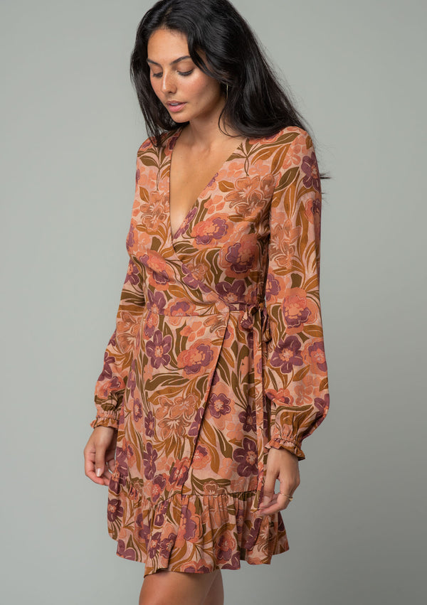 ![[Color: Clay/Olive] A side facing image of a brunette model wearing a clay brown and olive green retro floral print mini wrap dress. With long sleeves, a ruffled hemline, and a side tie closure.](http://www.shoplovestitch.com/cdn/shop/products/I-72997W-RYN-QC-orange-brown-wrap-dress-5_{width}x.jpg?v=1748481724)